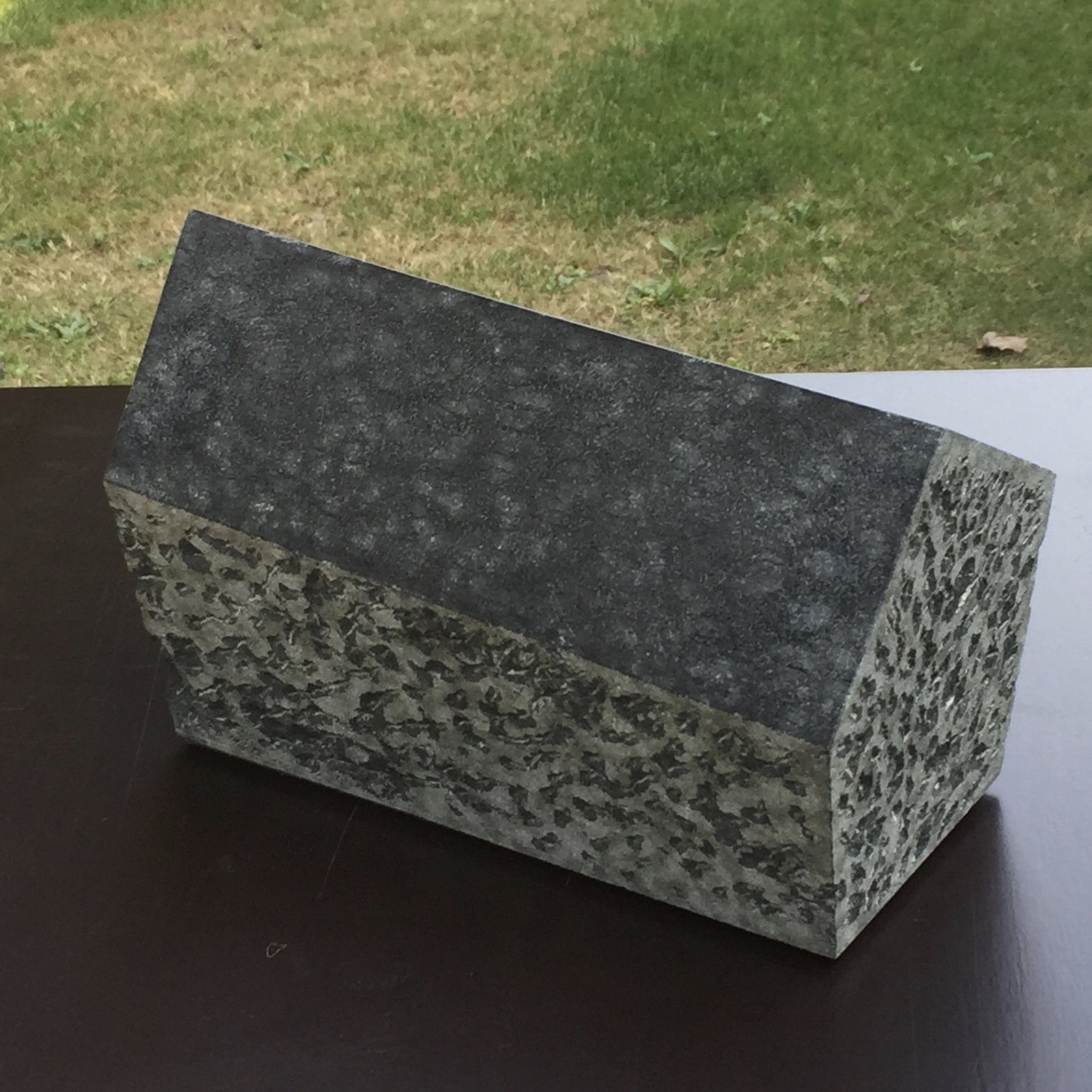 Als inspiratie heb ik gekeken naar de schuren en huisjes van Bea van Twillert. Het werk is gemaakt van diabas, een mooi hard materiaal om in te werken. Het "dak" is zoet geschuurd, de zijkanten zijn grof aangehakt en daarna geschuurd.