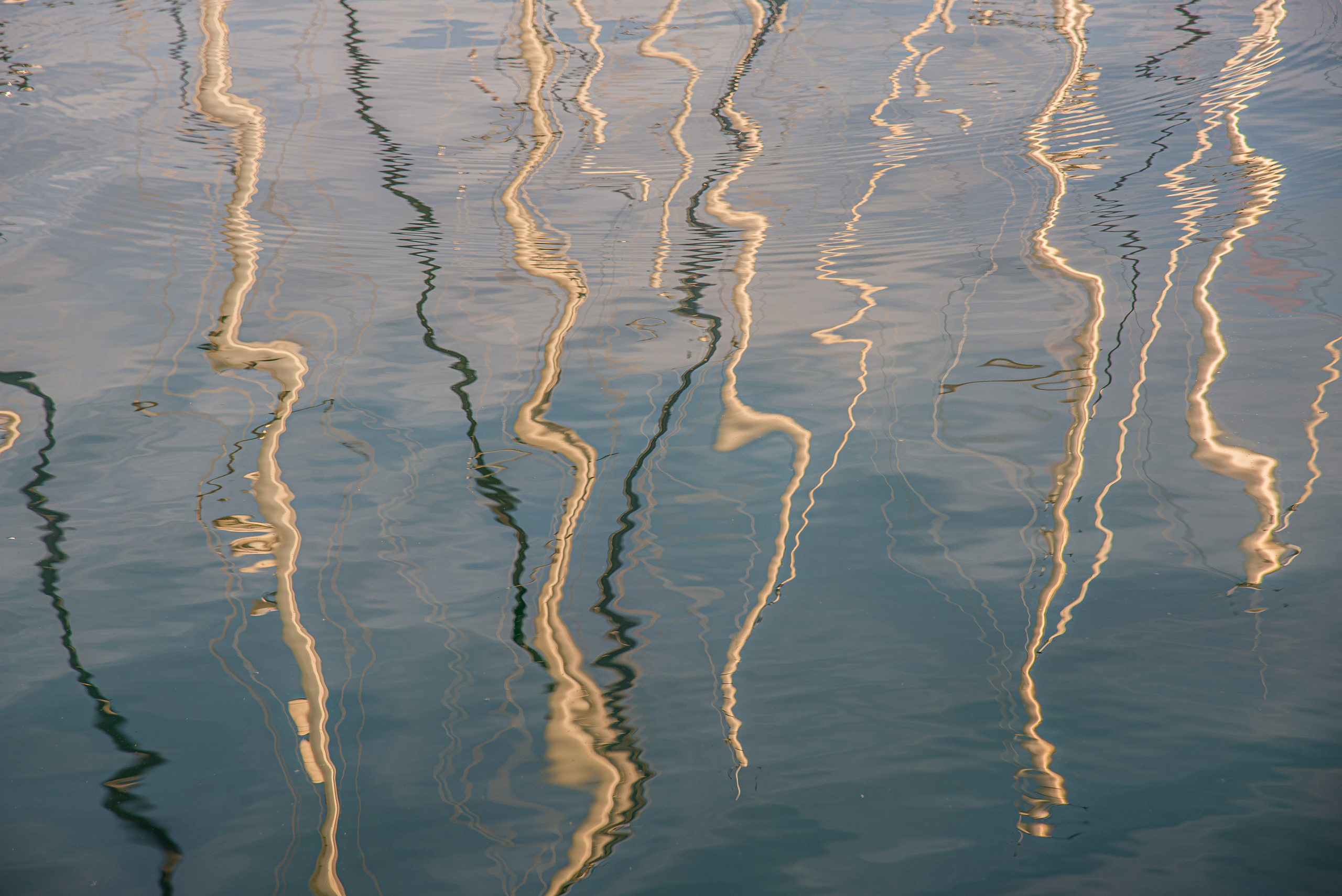 In de haven van Opatija, Kroatië liggen de zeilschepen rustig te dobberen om gezien te worden. Het water was rustig waardoor de reflectie van de masten nauwelijks werd verstoord.