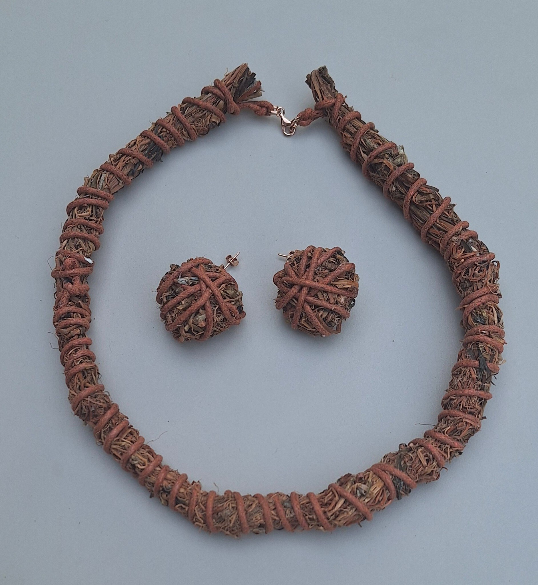 Hals en oorsieraad van zeegras met leer en rood verguld zilveren (925) sluiting en haakjes. Oorsieraad 3 bij 3 cm.