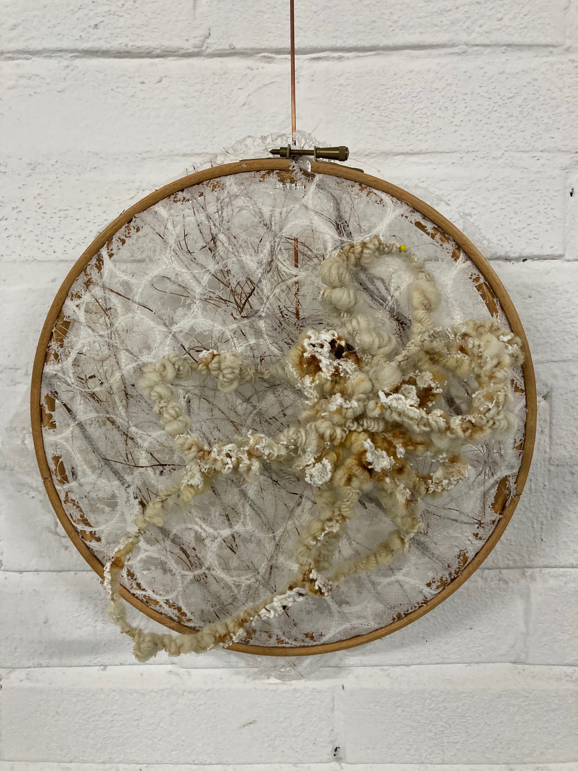 Dit werk onderzoekt de relatie tussen handeling en herinnering. Door middel van knopen, wikkelingen en textiele structuren wordt het materiaal drager van sporen, beweging en tijd.