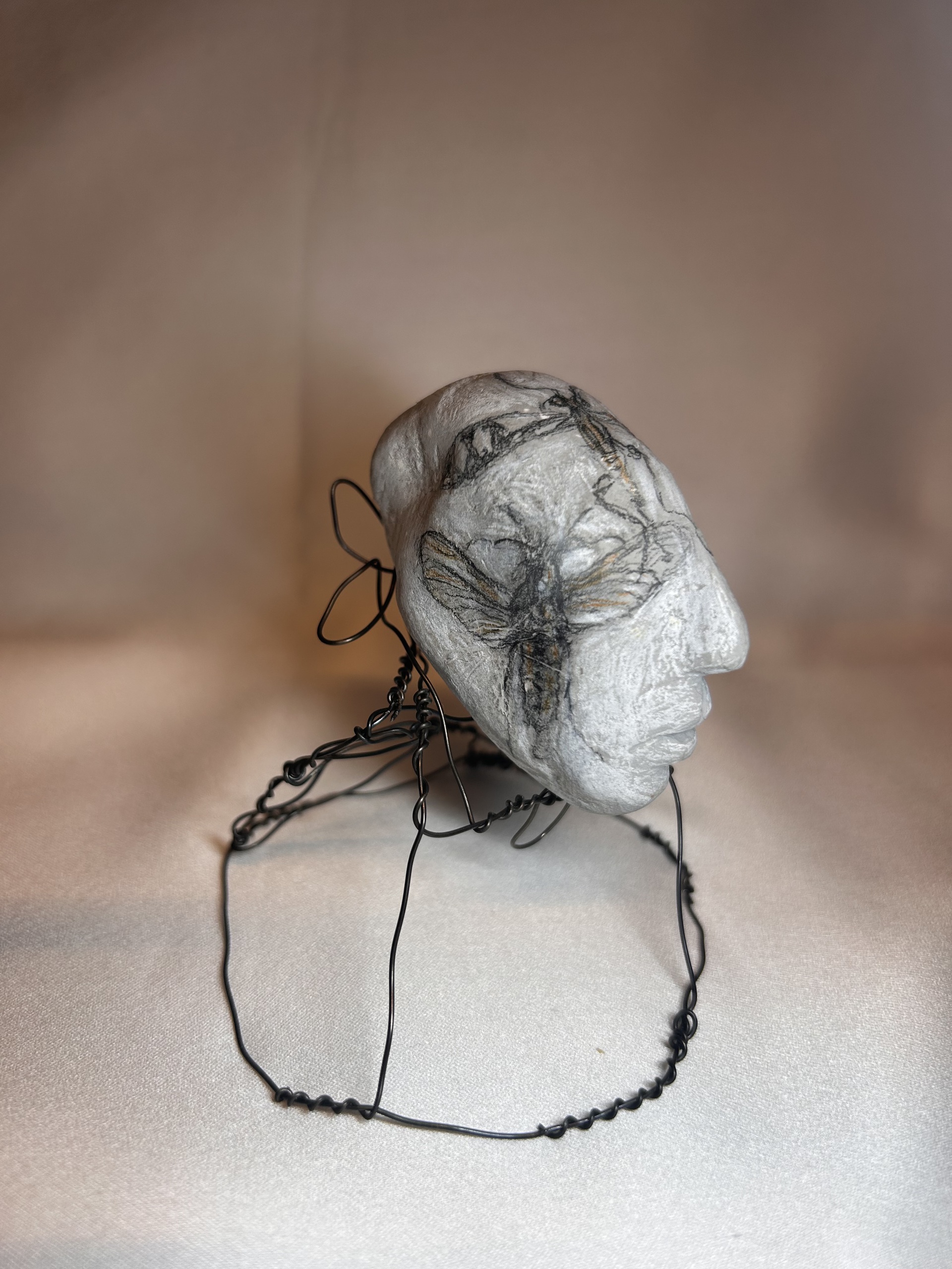 Draad- klei sculptuur met tekening insect.
