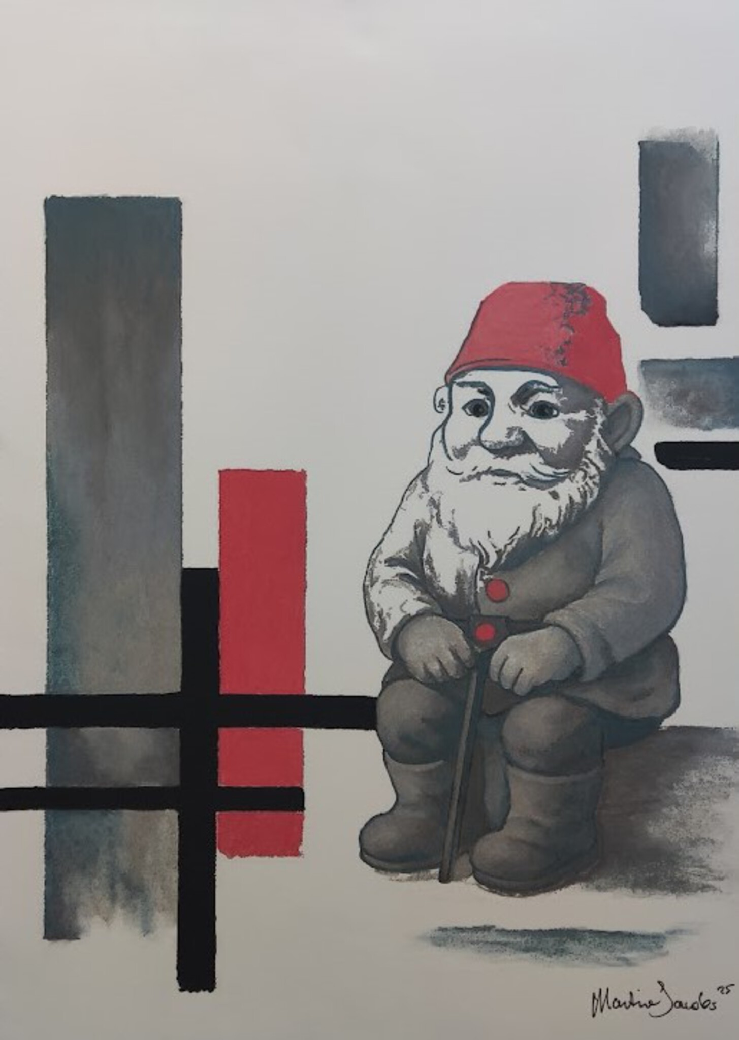 Kabouter Doesburg 2025 Toen ik aan dit pastel begon, wilde ik twee werelden samenbrengen die ogenschijnlijk niets met elkaar te maken hebben. Aan de ene kant is er het strakke, modernistische universum van Theo van Doesburg, waarin alles draait om orde, evenwicht en abstractie. Aan de andere kant is er de kabouter: een eenvoudig, bijna kneuterig figuurtje dat we allemaal kennen uit tuinen en sprookjes. De kabouter is voor mij een symbool van iets wat we soms vergeten in de kunst: speelsheid, nostalgie en een stukje volkscultuur waar veel mensen heimelijk van houden. Door hem neer te zetten voor een achtergrond die refereert aan De Stijl, confronteer ik de toeschouwer met de spanning tussen ‘hoge’ en ‘lage’ kunst. Mag een kabouter wel in zo’n verheven, gestileerde omgeving bestaan? Zijn rode muts en de rode vlakken op de achtergrond verbinden hem toch weer met het abstracte raster, alsof hij er misschien toch thuishoort. Ik vind het interessant dat hij een beetje uit de toon valt en tegelijkertijd een dialoog aangaat met de compositie achter hem. Dit werk gaat over hoe beelden en stijlen uit heel verschillende werelden elkaar kunnen versterken. Over hoe wij als kijkers betekenis geven, juist als iets wringt of niet helemaal klopt. En misschien is het ook gewoon een knipoog: een herinnering dat kunst niet altijd bloedserieus hoeft te zijn.” dit is print door de kunstenaar ontworpen handingekleurd met pastel potlood.