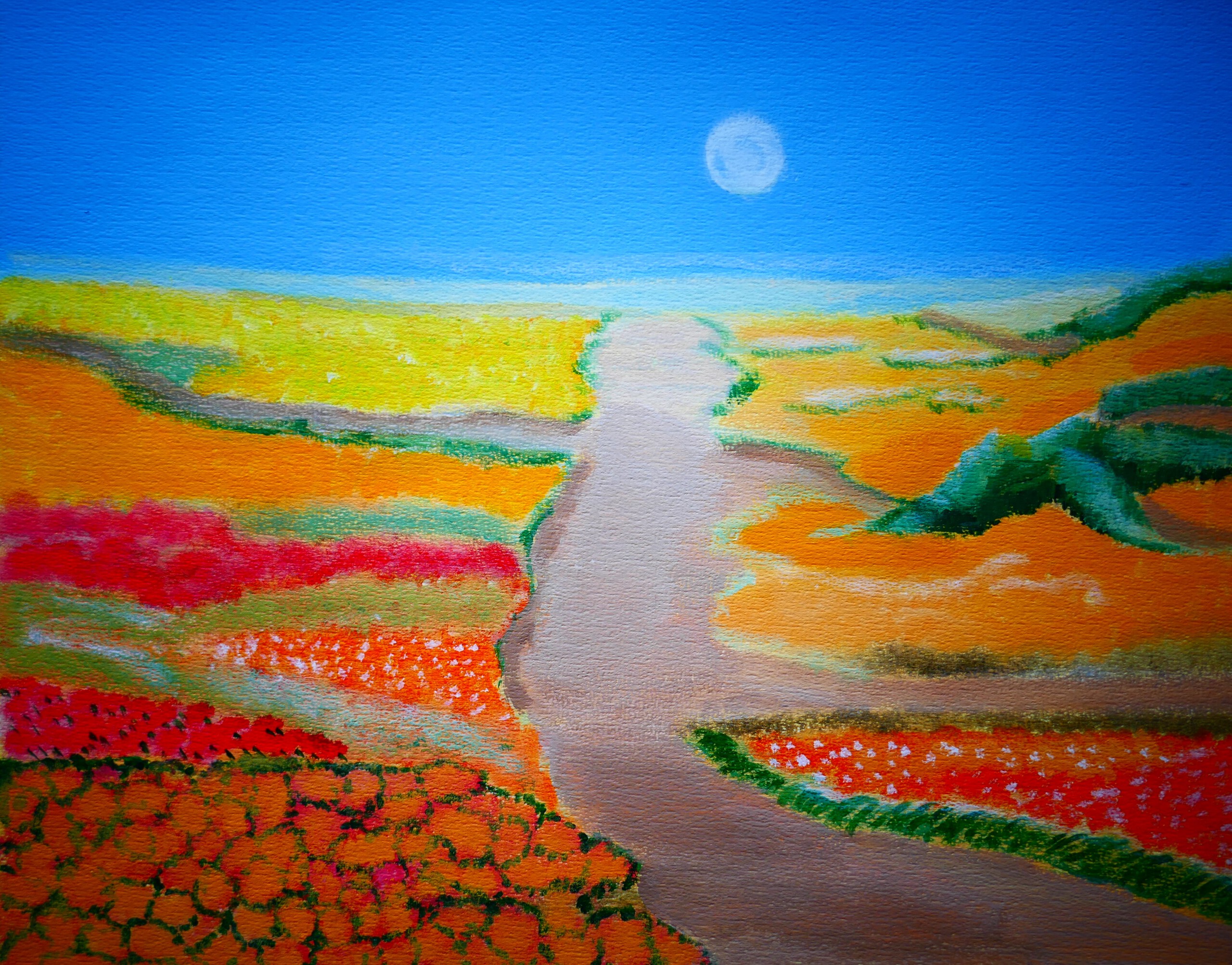 Figuratief Rood Oranje Geel Landschap Blauw Acryl Groen Papier Kleurrijk Schilderkunst Natuur Acrylverf
