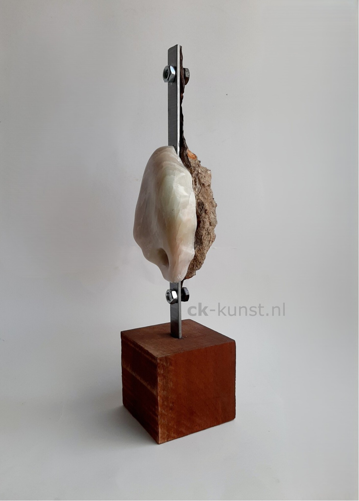 Speksteen met metaal en een anode op mahoniehout sokkel. Met een glimmende mooie lichte kant en een verroest en verweerde donkere zijde. Welke kant vind jij mooier, zou je liever laten zien? Omarm behalve de lichte zijde ook de schaduwzijde, want zonder beide zijden zal het nooit een harmonieus geheel zijn.