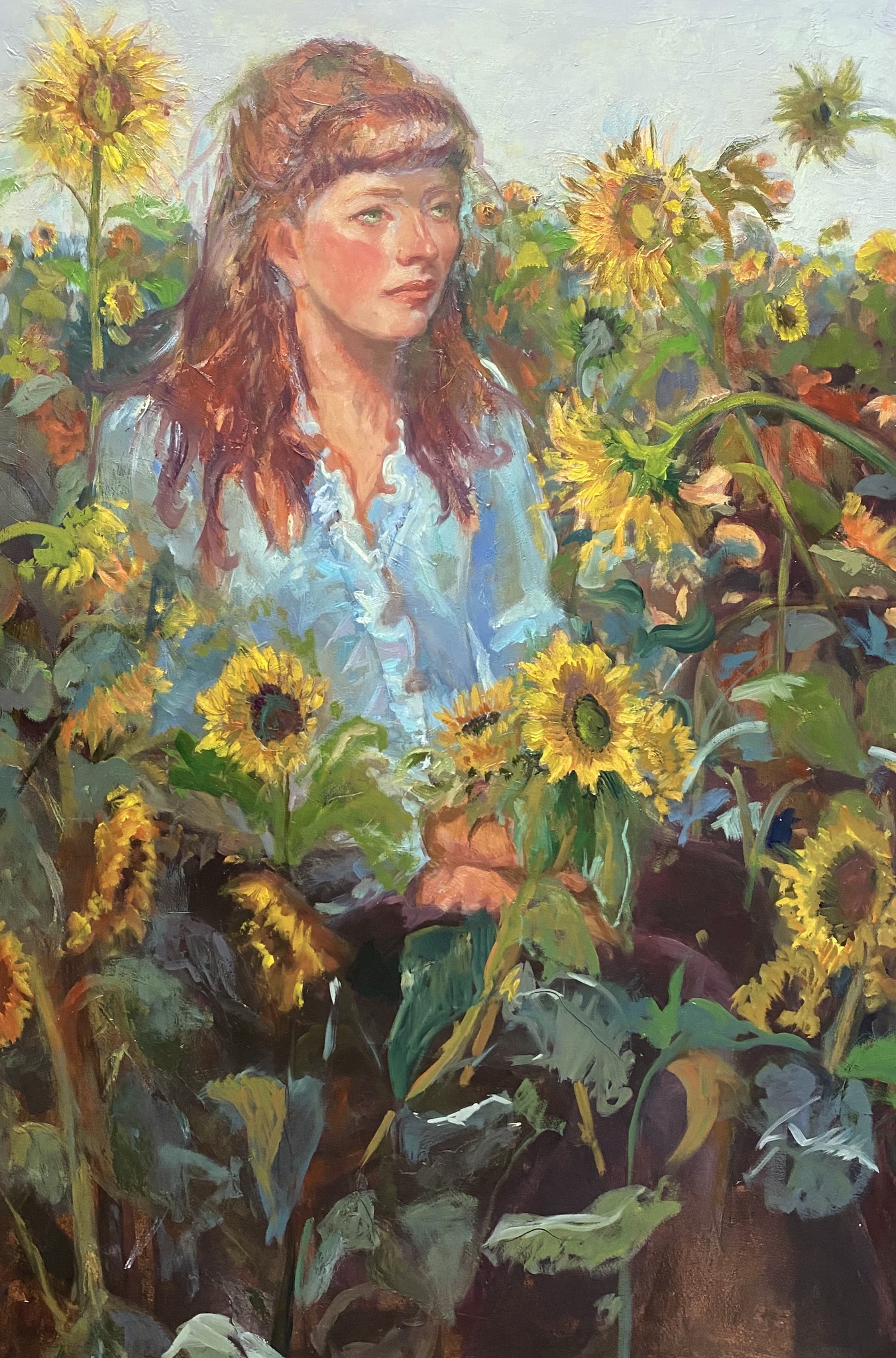 Schilderij Meisje Figuratief Geel Bloemen Vrouw Portret Woman Olieverf Oilpainting Portrait Light Zomer Zonnebloemen Veld Sunflowers Nature Emotion Impressionism Flowerpainting Field Quietness Contemporaryart