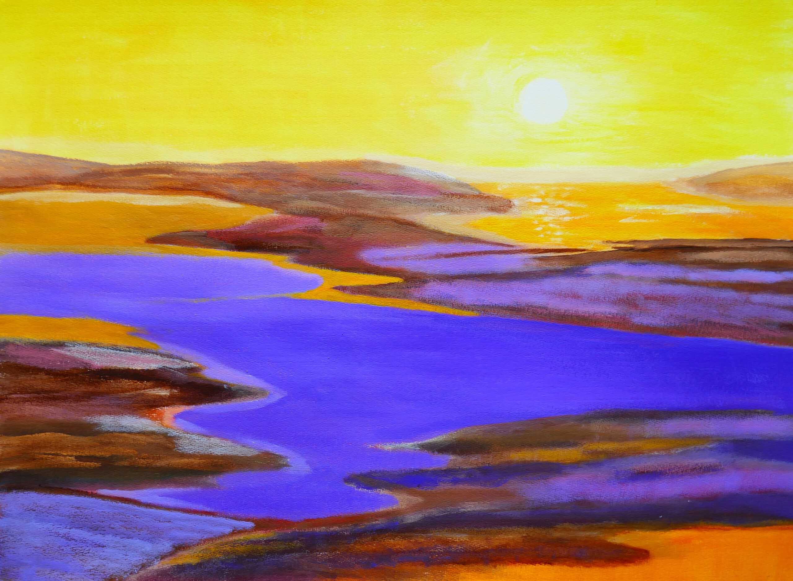 Schilderkunst Acryl Acrylverf Papier Natuur Landschap Figuratief Kleurrijk Violet Oker Oranje Geel Amber