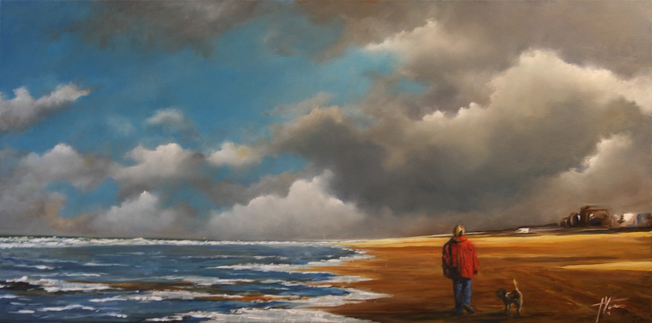 horizontaal strandtafereel met fraaie wolkenpartijen en licht donker contrast