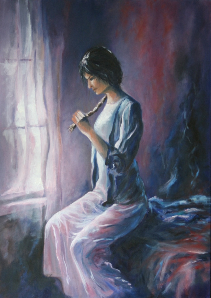 romantisch tafereel - model zittend op bed in gefilterd ochtendlicht