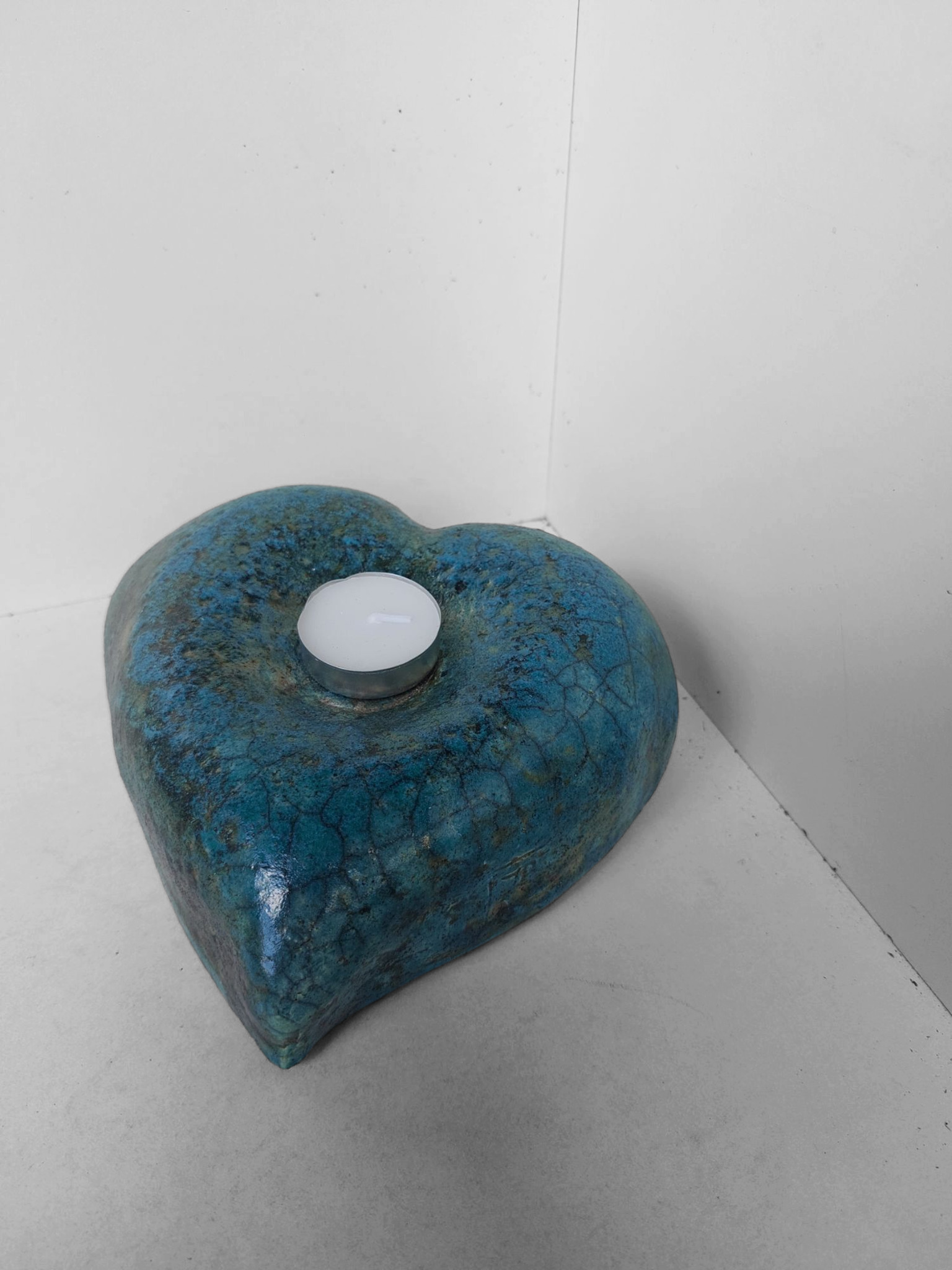 Dit hart is Raku gestookt en heeft een mooie craquelé turquoise glazuur met een kaarsje erop. Kan voor de sier of als urn.