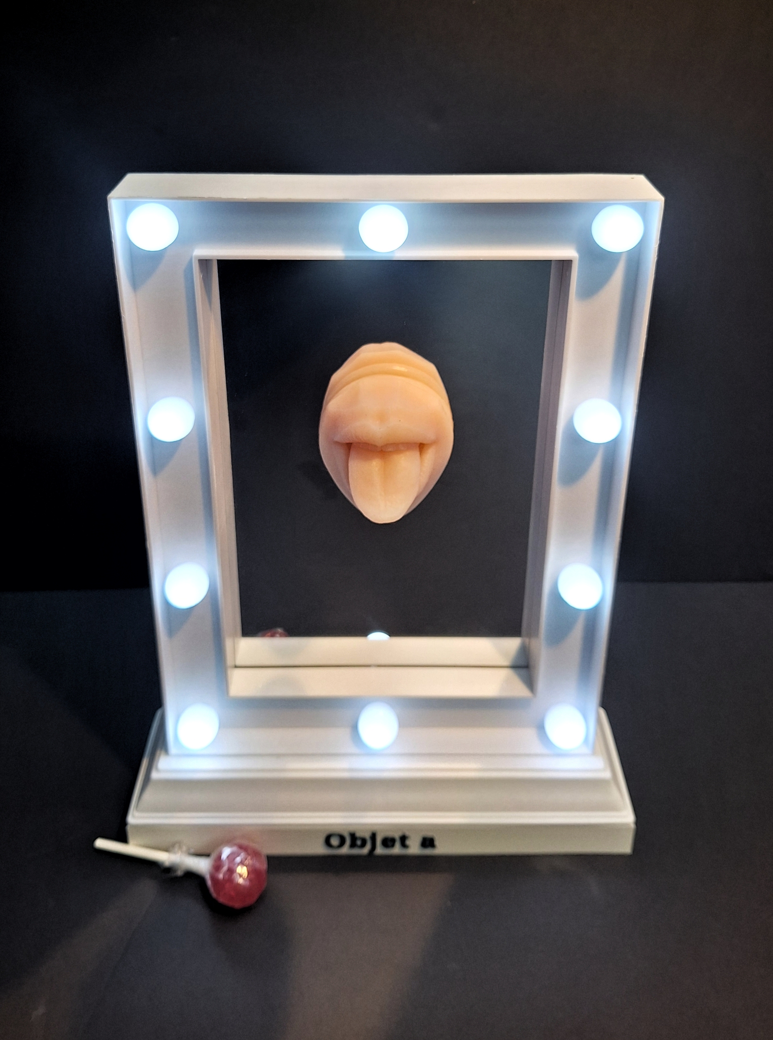 Objet a is a sculptural installation that interrogates desire and consumer culture through a psychoanalytic lens. At its center is a silicone tongue, suspended in front of a mirror framed by lightbulbs like a vanity or store display. Beneath the mirror, the inscription Objet a references Jacques Lacan’s theory of the elusive object of desire — the unattainable “thing” that fuels longing but can never truly be possessed. The mirror also invokes Lacan’s famous mirror stage, the formative moment when the child first recognizes itself in a reflected image. This recognition is also a misrecognition: the self is seen from the outside, as an image that is coherent yet alien. In Objet a, this paradox is made tangible — the tongue reaches toward its own reflection, a gesture of desire toward an unreachable other, or toward the self as other. In front of the mirror lies a lollipop: a symbol of childish craving, consumer indulgence, and the endless cycle of promise and lack. The installation plays with seduction and frustration, with the mirror serving as a stage for both self-recognition and estrangement. By using playful and artificial materials — a plastic tongue, a glossy frame, a cheap piece of candy — Objet a raises pointed questions about how desire is constructed, aestheticized, and commodified in contemporary visual culture.