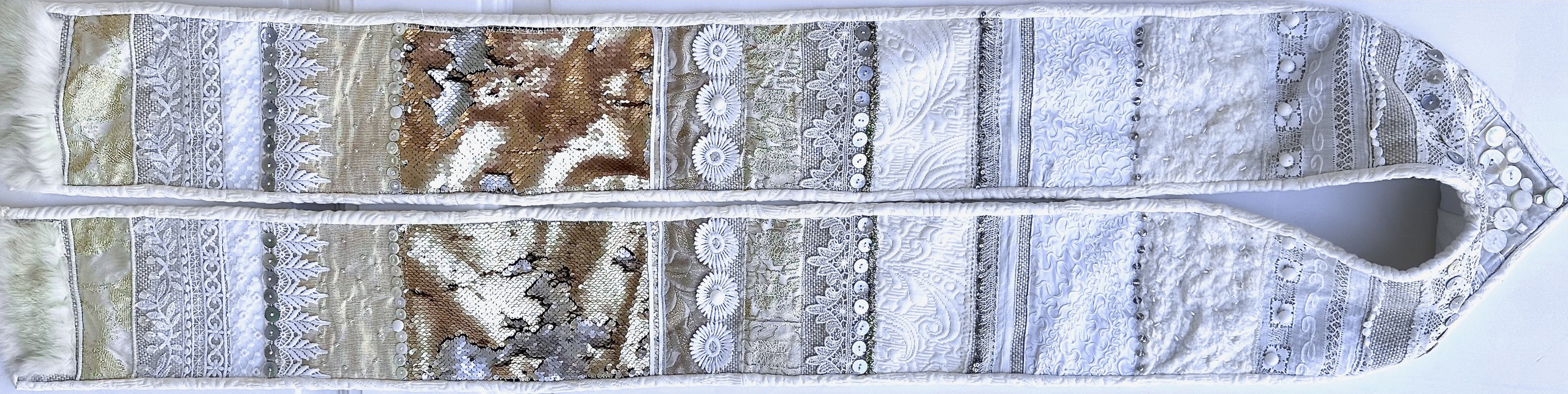 Wiite stola voor kerkelijk gebruik met slecht zienden. Groot contrast in materialen, hard en zacht, glinsteringen, belletje, kralen, oude doopjurken, kant, relief. Gemaakt als afscheidscadeau voor predikant Wija van der Kaaden, die na 40 jaar afscheid nam als geestelijk verzorger van Bartimeus in Doorn