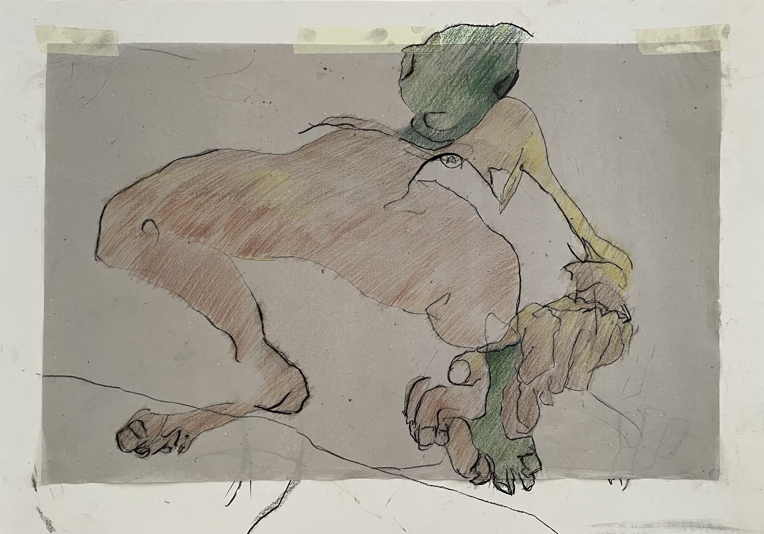 Kleurpotloot en Siberisch krijt op vloeipapier en wit tekenpapier.