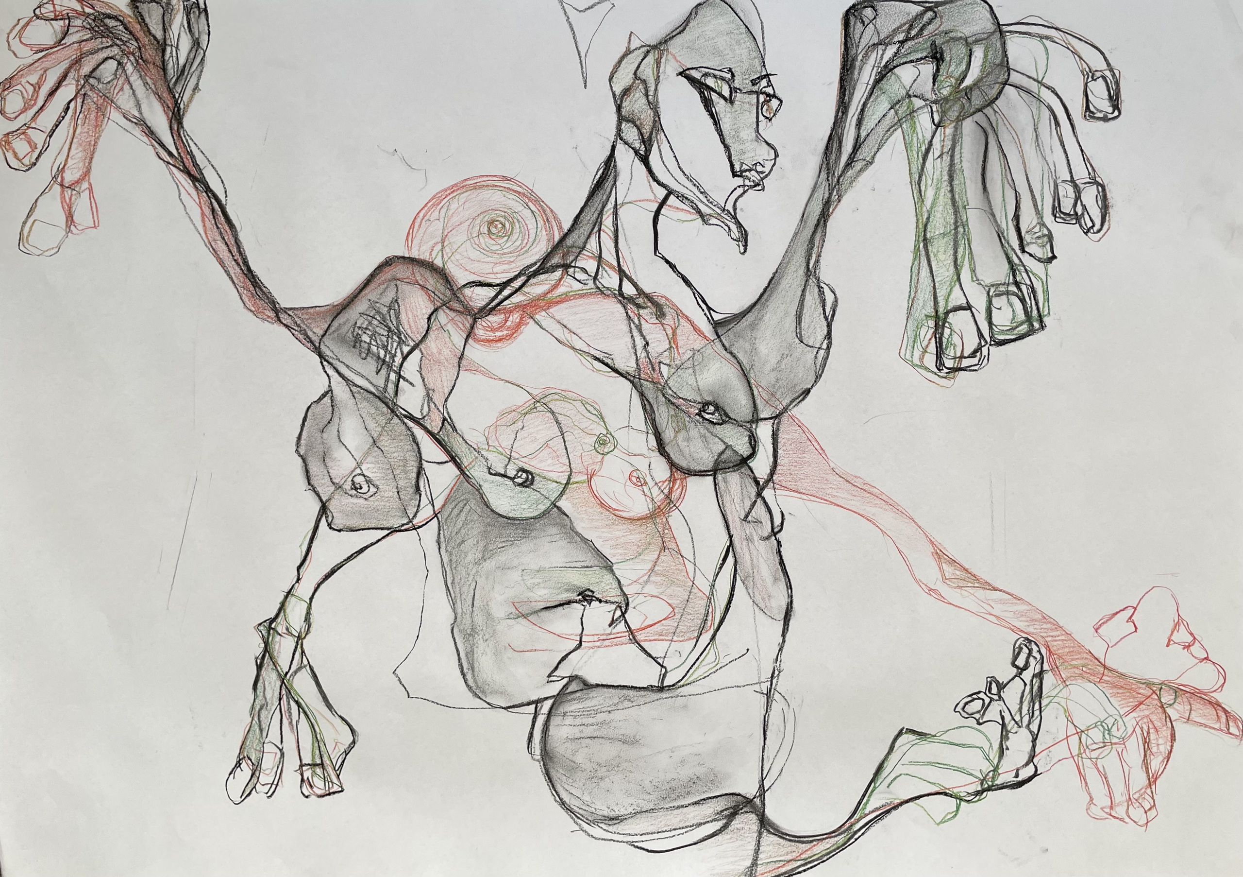Kleurpotloot en Siberisch krijt op wit tekenpapier.