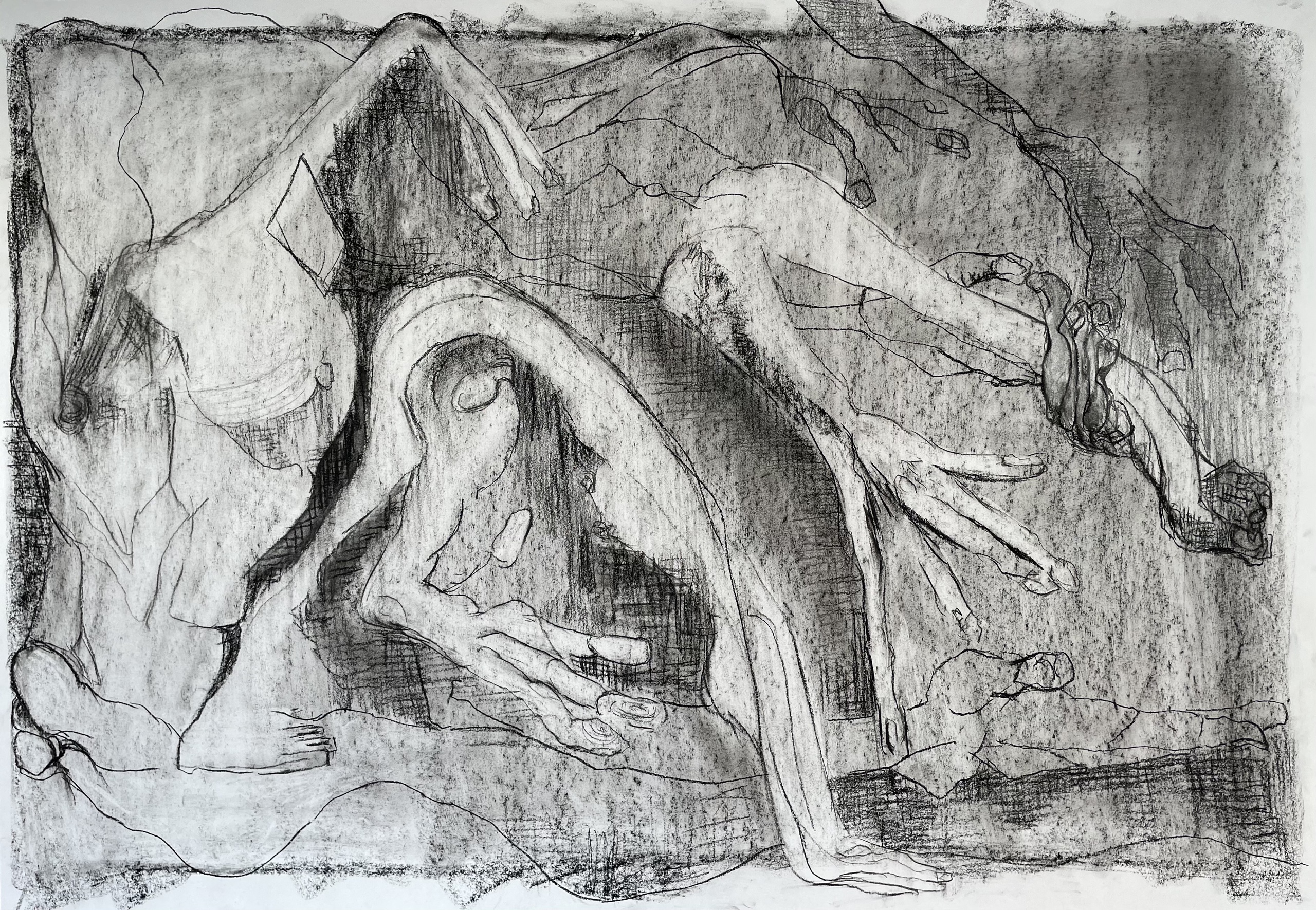 Houtskool en Siberisch krijt op wit tekenpapier.