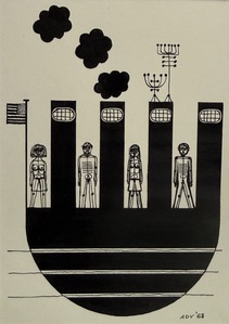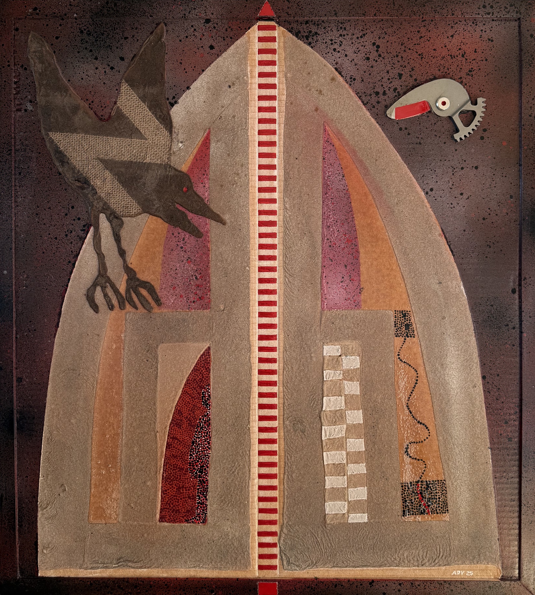Basis is en stuk karton, met houten lijstje, waarop verschillende kleuren zand is gelijmd. Sommige vlakjes zijn alleen bedekt met lijm. Rond en binnen het centrale beeld zijn donkerrode, zwarte en andere kleuren geschilderd, gespoten of gestippeld. Rechtsboven een stukje gereedschap. Vogel links gevormd door zand en lijm en naderhand bewerkt met priem.