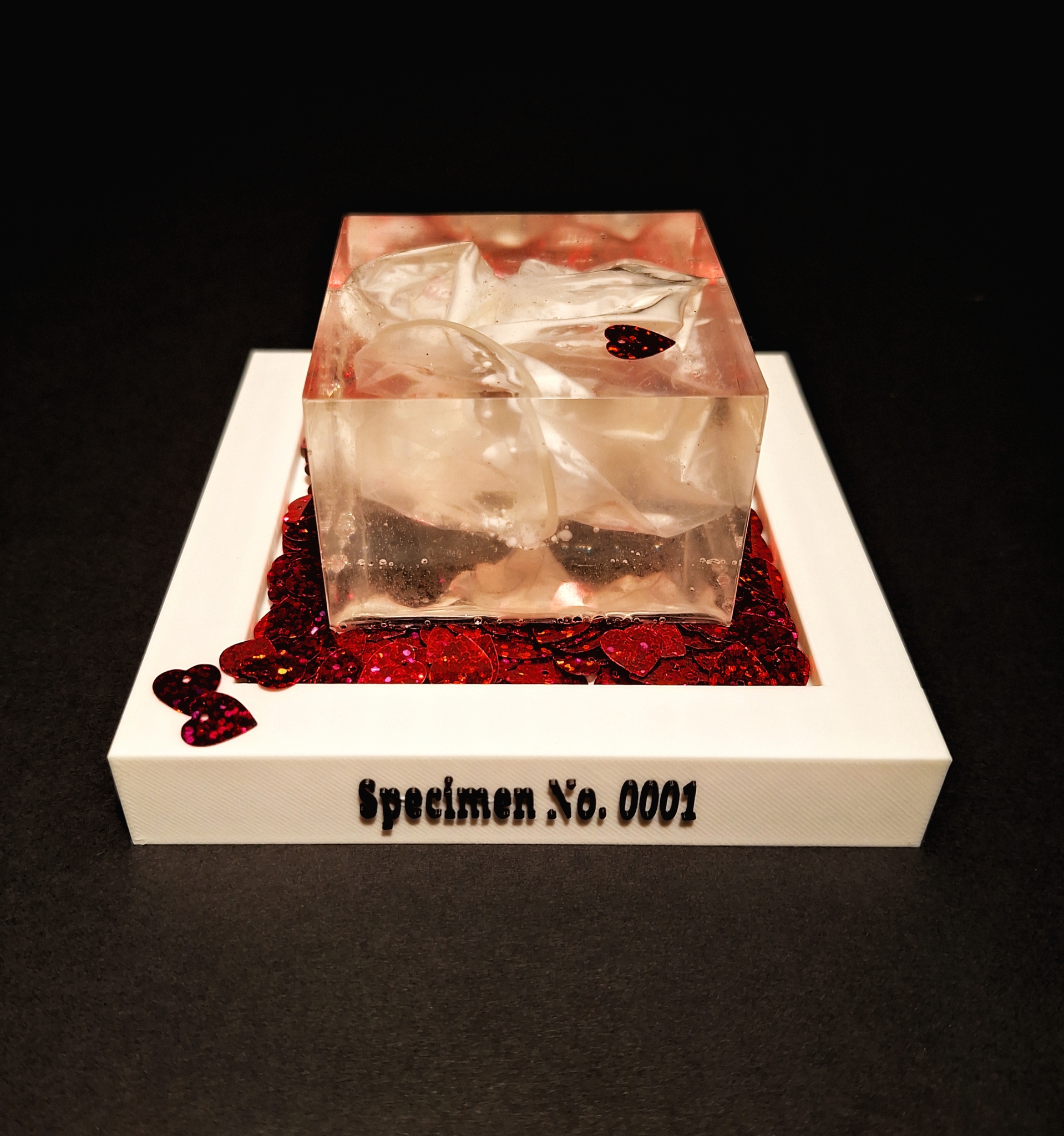 A used condom containing traces of semen is preserved in a transparent resin cube. It rests on a bed of red glitter hearts — symbols of romantic love, mass-produced and disposable — and is framed like a biological artifact, titled Specimen No. 0001. The work juxtaposes the intimate with the clinical, the emotional with the absurd, the transient with the eternal. By fossilizing a remnant of sexual activity and placing it in a mock-scientific, kitsch-laden context, the piece invites reflection on the contradiction between human meaning-making and nature’s impersonal reproductive logic. Are we lovers, agents, or just vehicles and vectors for DNA? In this sterile reliquary, even desire becomes evidence, and love is reduced to packaging.