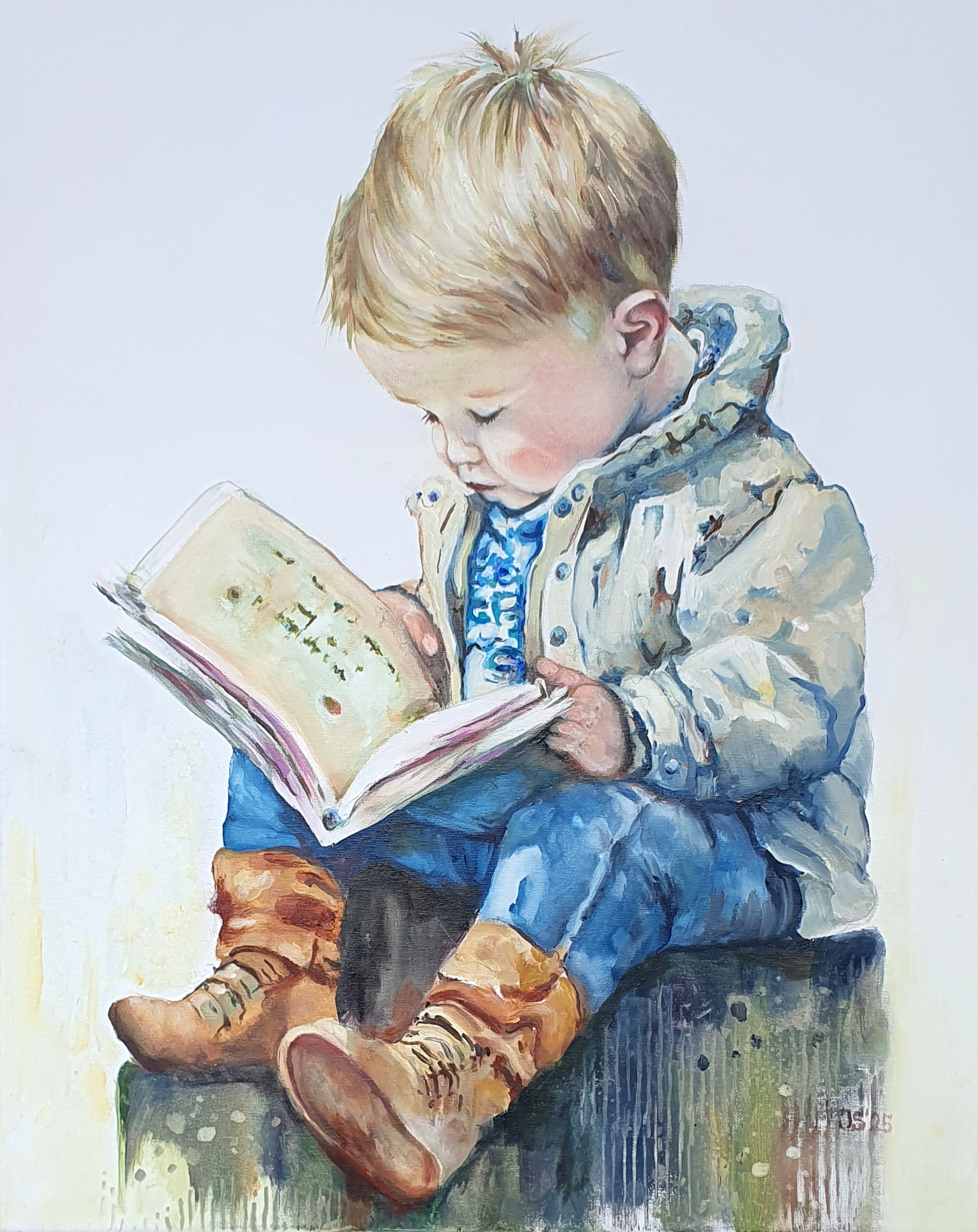 Een jongetje, zittend , in spijkerbroek en winterjas, leest zijn eerste boekje. Zijn naam mag je zelf verzinnen... olieverf op doek..