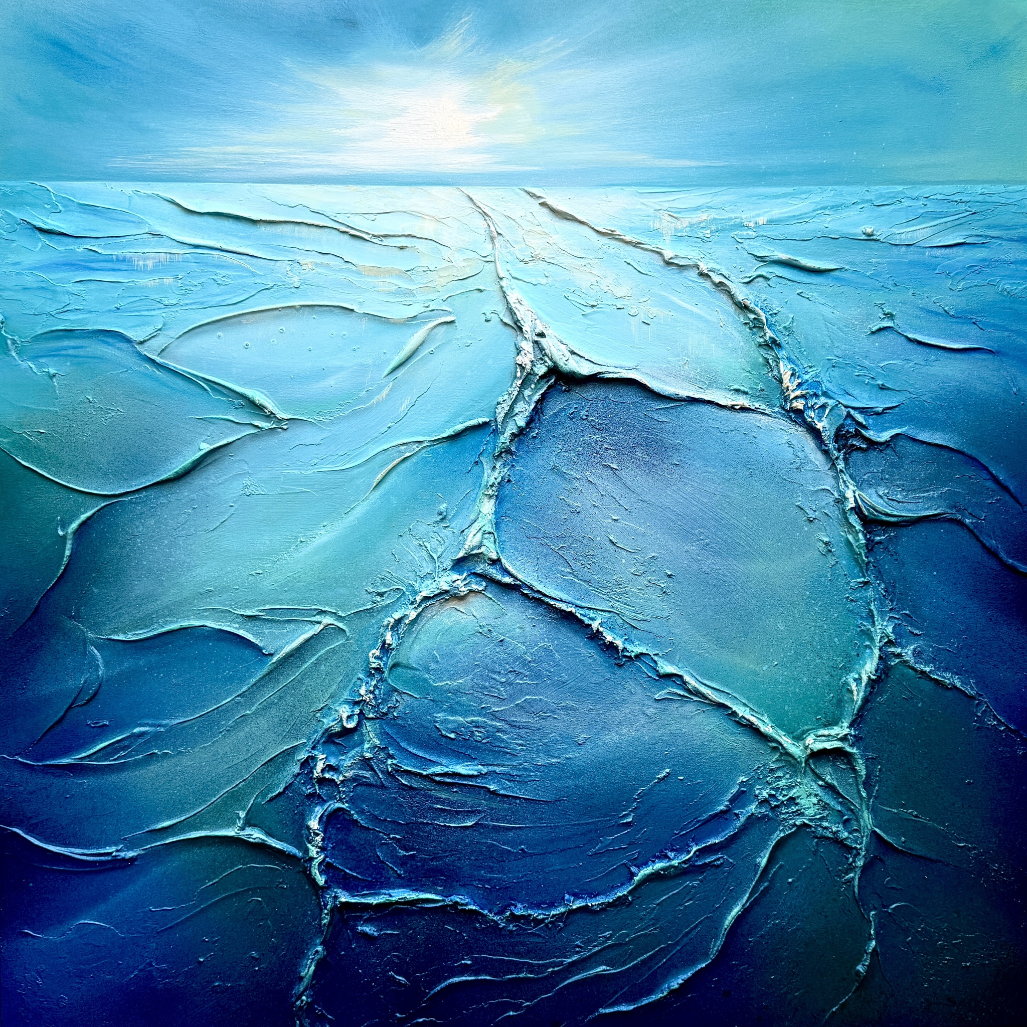 In dit schilderij heb ik een gevoel van grenzeloze energie en een vooruitstrevende visie gekanaliseerd door de textuur van acrylverf en de nevel van spuitverf. De koele, weidse blauwtinten en de verre warmte van de horizon verenigen het abstracte met de toekomst en nodigen de kijker uit om een wereld binnen te stappen die zowel onbekend als opwindend is. Het brengt een gevoel van kalme diepte en levendig optimisme met zich mee, waarvan ik hoop dat het elke ruimte een dynamische maar serene sfeer zal geven.
