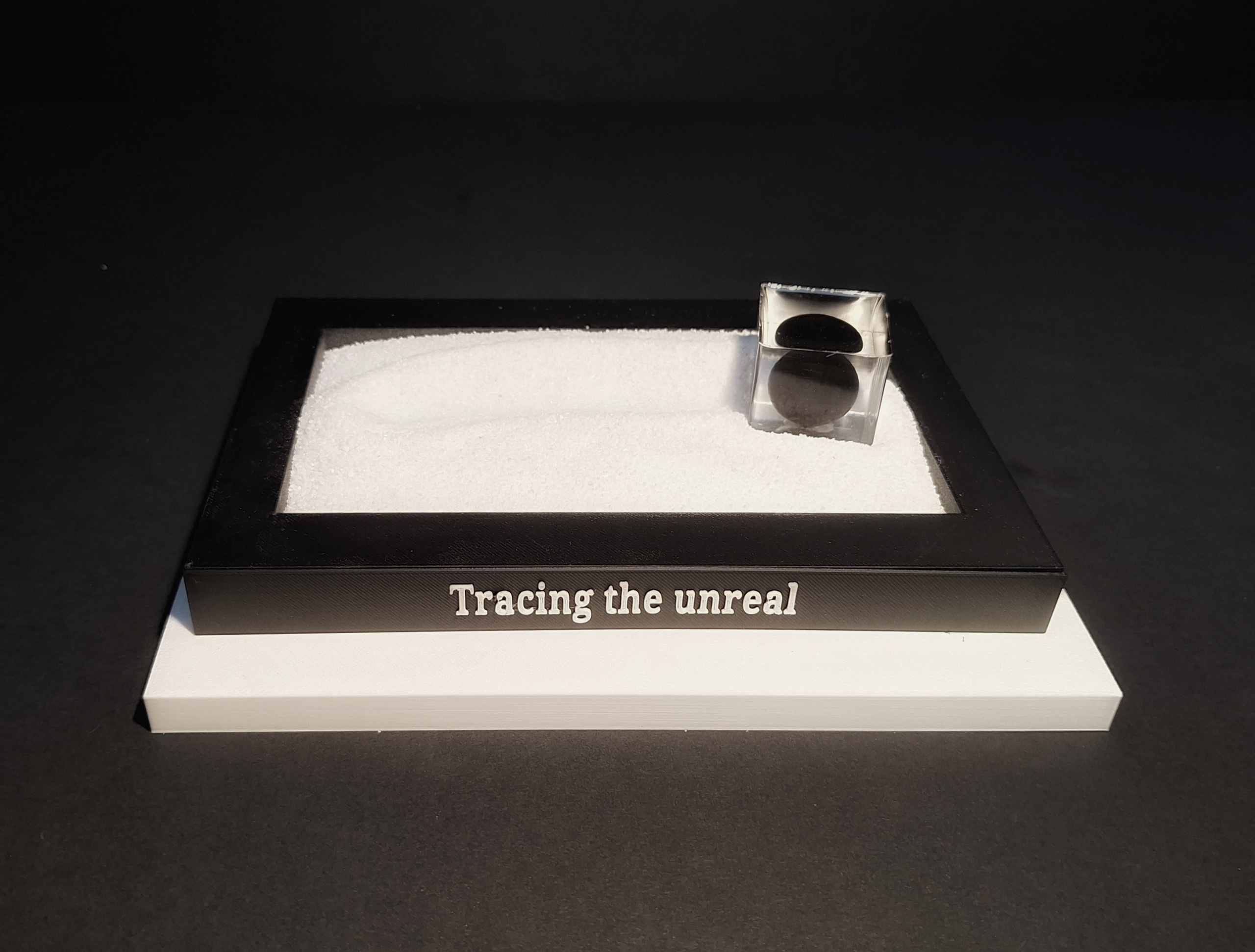 This installation presents an apparently simple scene: a black platform filled with white sand, bearing the clear trace of a rolling object — a curved line ending at a transparent cube that encloses a ball. The visual impression immediately suggests a causal link: the ball must have rolled and left its trace in the sand. But this assumption is misleading. As the ball is entirely embedded in resin, it could not have moved. The work confronts the viewer with their own cognitive automatisms. Drawing on the philosophies of David Hume and Immanuel Kant, it questions the immediacy with which we perceive causal relationships in the world around us. For Hume, causality is not an objective feature of reality, but a habit of the mind: we expect a cause whenever we see an effect. Kant goes further: the human mind projects categories such as causality onto experience — we cannot help but think in terms of cause and effect. Tracing the Unreal renders this mental projection visible. The installation is a visual paradox, a silent trap for thought: what appears self-evident turns out to be impossible. In the tension between perception and reality, between thinking and knowing, space opens up for doubt — and wonder.