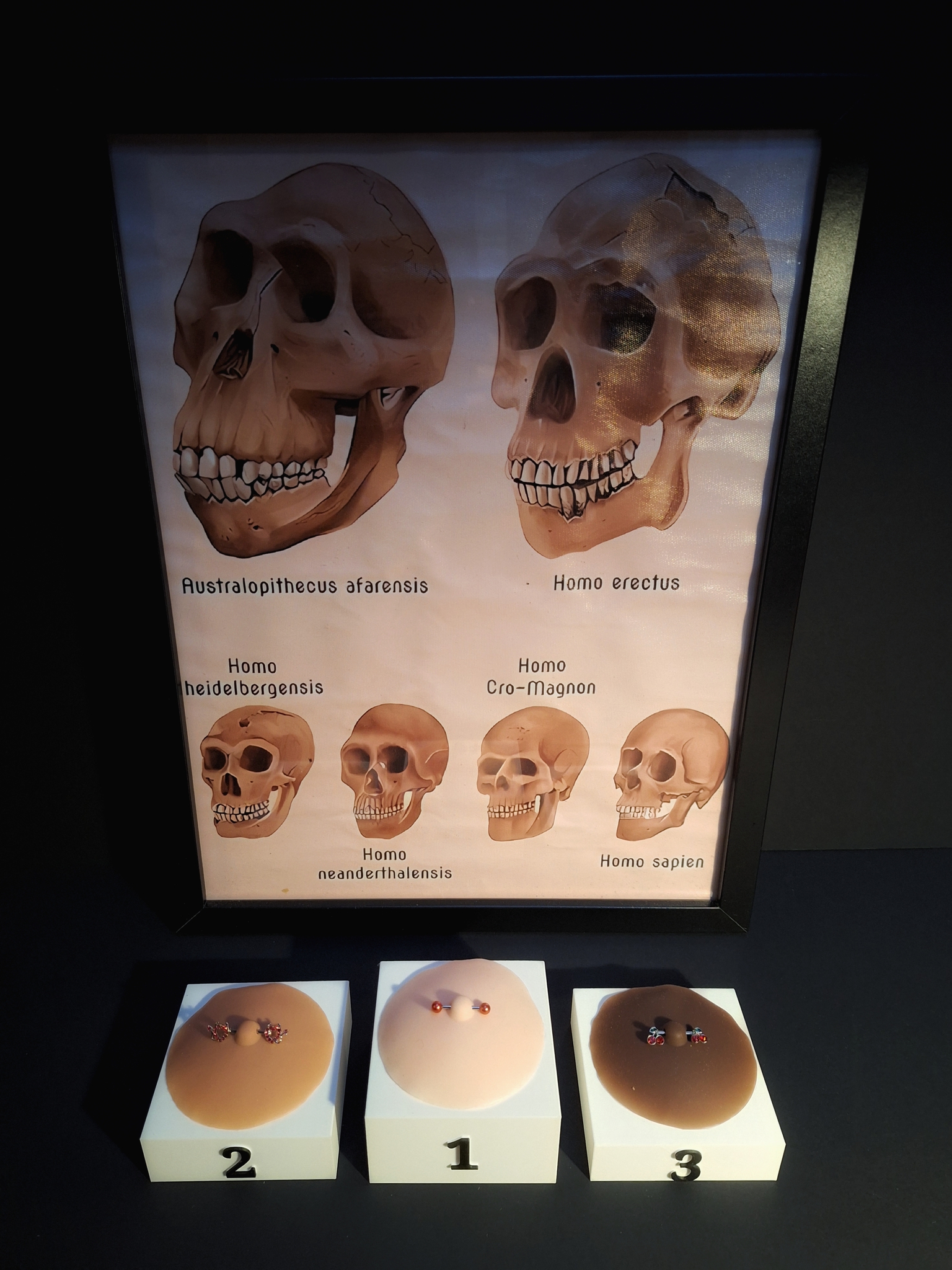 This artwork presents a grotesque and ironic tableau that parodies the logic of racial and evolutionary classification. In the background, a didactic illustration of human evolution shows a progression from Australopithecus to Homo sapiens, echoing the pseudo-scientific diagrams once used to justify hierarchies of race and civilization. In the foreground, three artificial nipples of varying skin tones are displayed on numbered pedestals—evoking both a natural history museum and a beauty contest. The nipple marked “1” is pale and centrally placed, while the darker nipples take positions “2” and “3”, subtly implying a ridiculous and disturbing hierarchy of desirability or advancement. By linking skin color and bodily ornamentation to evolutionary superiority, the work exposes the absurdity—and danger—of essentialist, racialized thinking. At the same time, it plays with pataphysical logic (after Alfred Jarry), embracing a world where the exception becomes rule, and where the nonsensical undermines all claims to objectivity.
