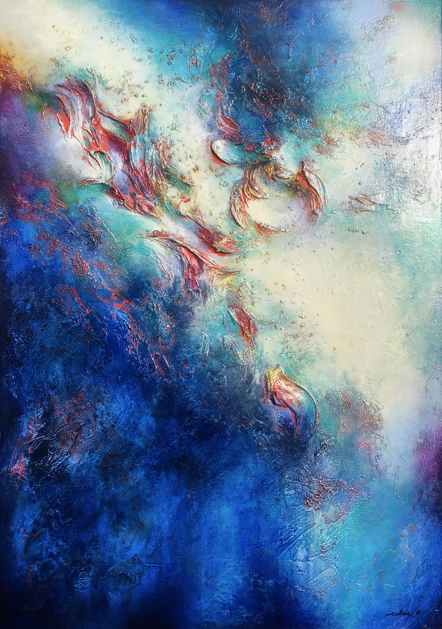 In dit werk heb ik mijn emoties gegoten in het samenspel van levendige blauwtinten en gloeiend licht. Door middel van abstracte vormen wilde ik de mysterieuze dans tussen kalmte en energie, duisternis en licht vastleggen. Er is een heldere, glanzende coating op het oppervlak aangebracht om het schilderij te beschermen tegen uv-licht, vocht en stof. Wilt u meer informatie of foto's van dit schilderij? Neem dan gerust contact met mij op via selenesart@gmail.com.