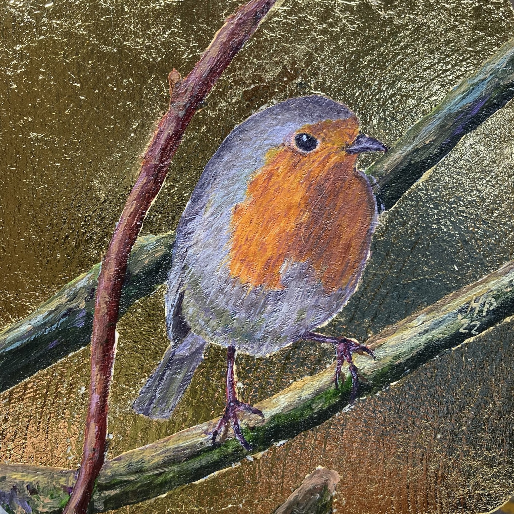 Miniatuurschilderij voor mijn deelname aan de miniatuurtjes-tentoonstelling "Visitekaartjes" bij Galerie Paterswolde in 2022 Geschilderd op een houten paneeltje, met als achtergrond goudkleurig slagmetaal