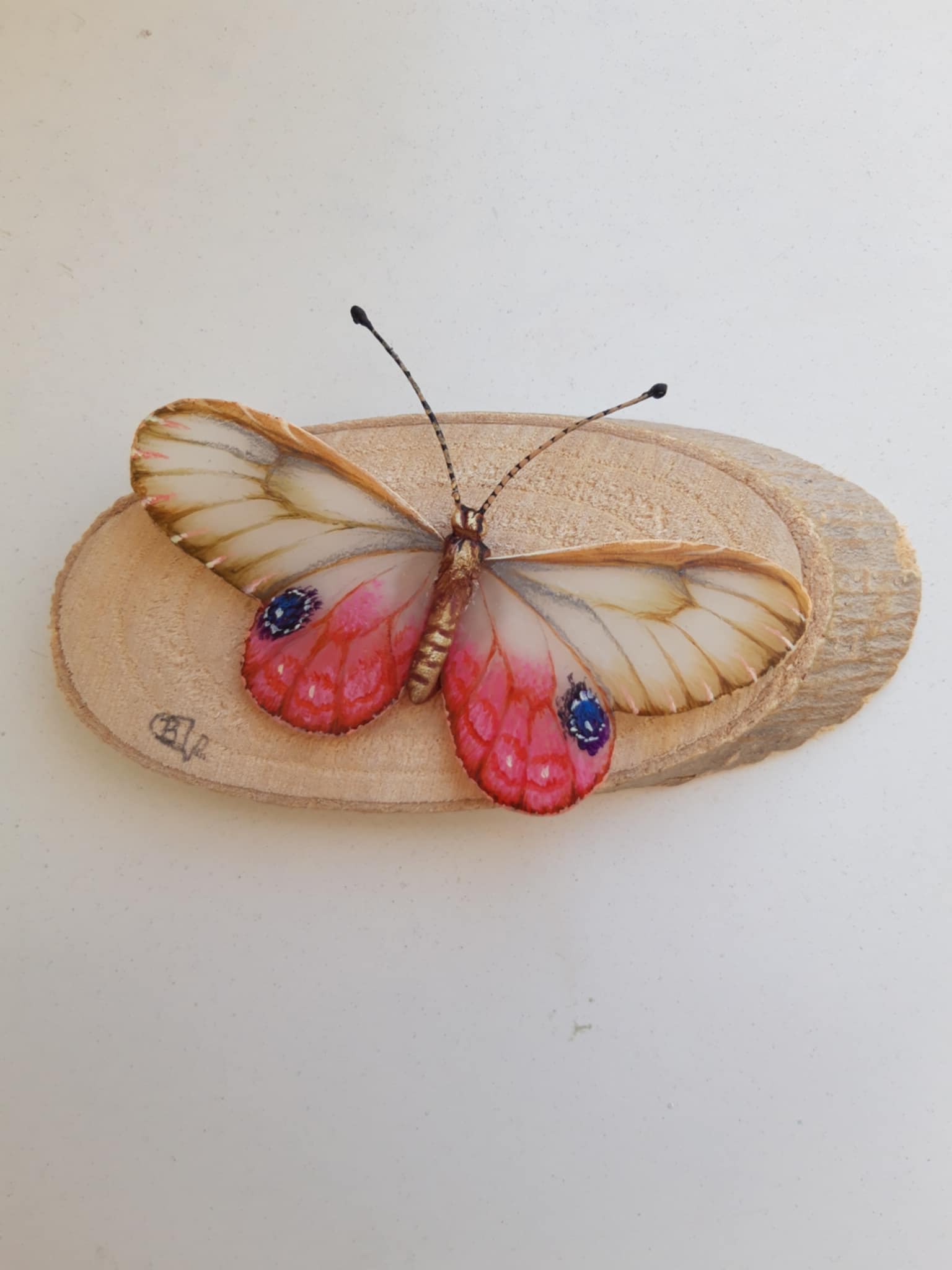 Vlinder op ware grote, geplaakt op een houten basis. De vleugels en romp van de vlinder zijn van koud porselein handgemaakt zonder het gebruik van mallen, en hand beschilderd. De antene zijn van zilverdraad. Prijs is excl. verzendkosten , die zijn € 8,25 met track and trace binnen Nederland.