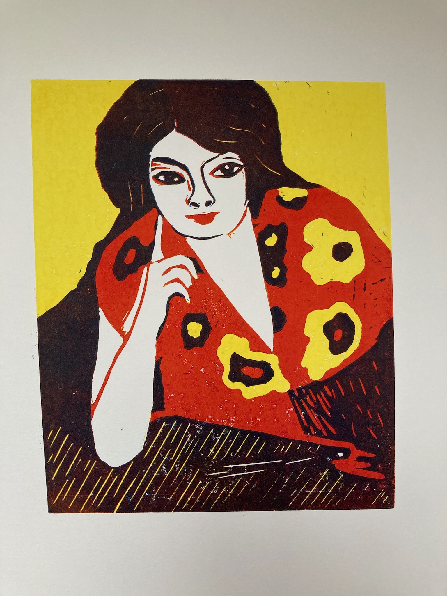 Linosnede-portret naar het schilderij "Vinger aan de wang" van Kees van Dongen, gerealiseerd met reductietechniek in 3 kleurlagen.
