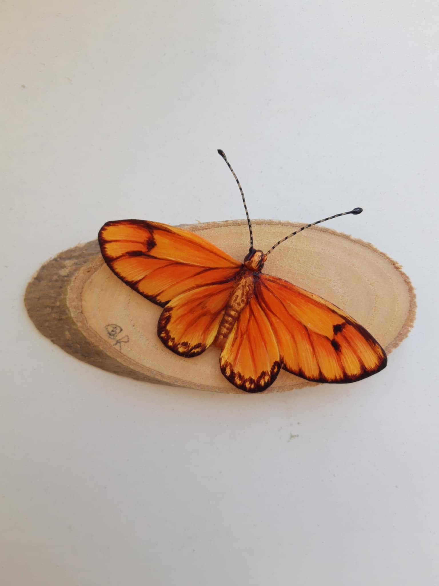 Vlinder op ware grote, geplaakt op een houten basis. De vleugels en romp van de vlinder zijn van koud porselein handgemaakt zonder het gebruik van mallen, en hand beschilderd. De antene zijn van zilverdraad. Prijs is excl. verzendkosten , die zijn € 8,25 met track and trace binnen Nederland.