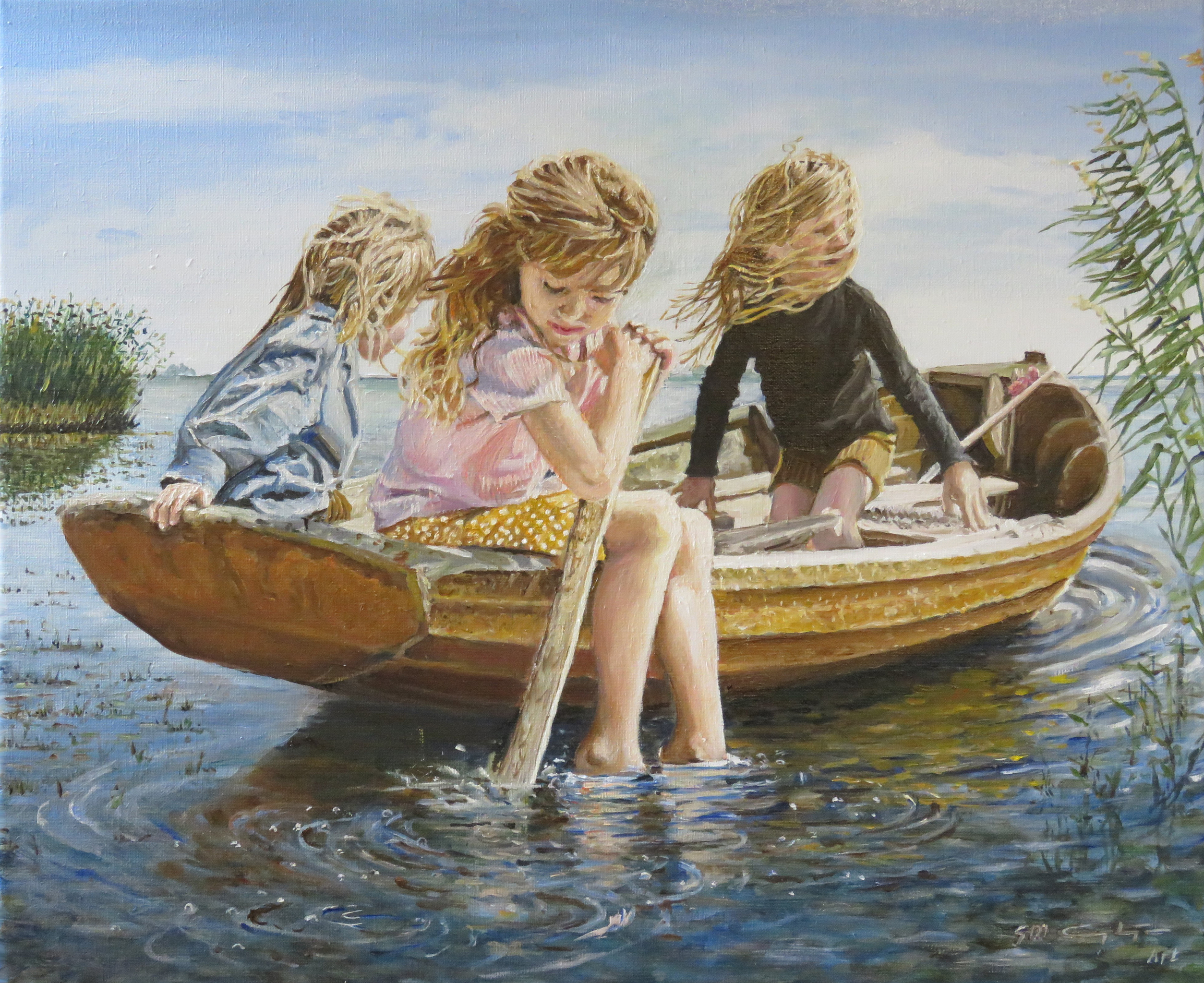 Drie kinderen genoten jaren lang van hun vakanties aan en op Mälaren. En 60 jaar later vierde één van de drie haar verjaardag en tergelegenheid hiervan liet haar vriendin deze herinnering op doek zetten. Tre barn njöt i många år av sina semestrar vid och på Mälaren. Och 60 år senare firade en av de tre sin födelsedag och i samband med detta lät hennes väninna föreviga detta minne på duk.