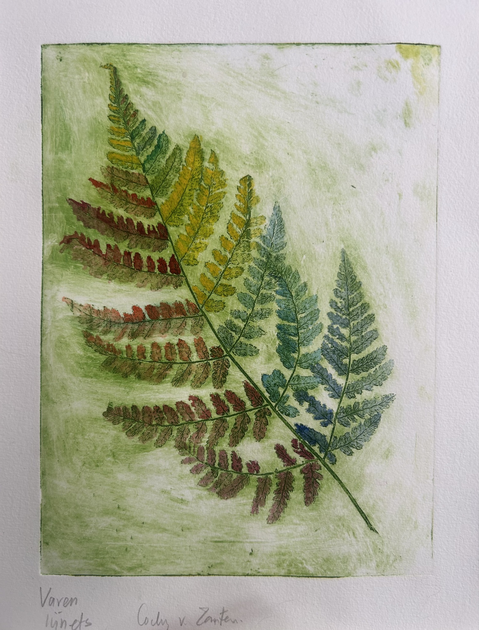 Varen, kopergravure, ets, ingekleurd met aquarelverf