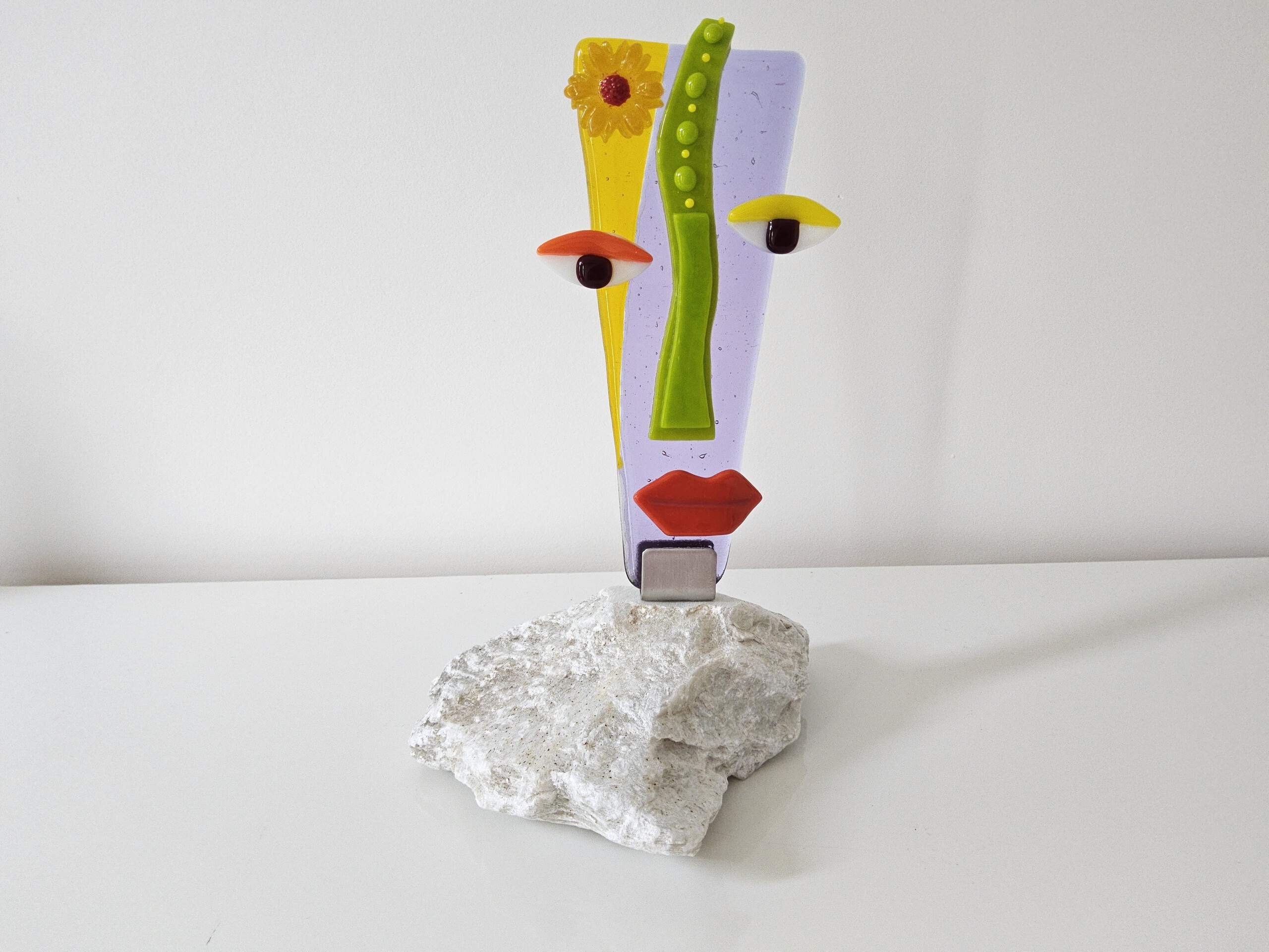 Hippie Fleurtje met bloem in het haar. Glas op steen. Afmeting zonder steen 20 hoog en bij de ogen 10 breed