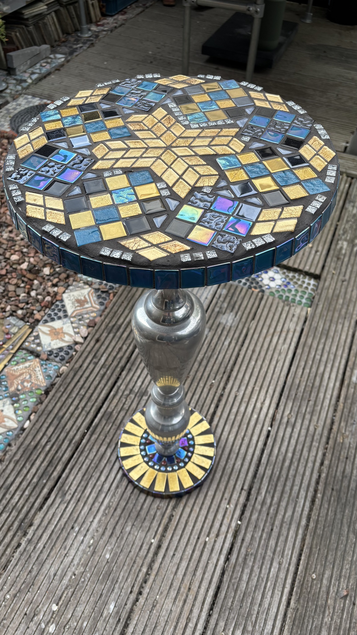 Tafel van zilver metaal bewerkt met keramische- en glas tegels.