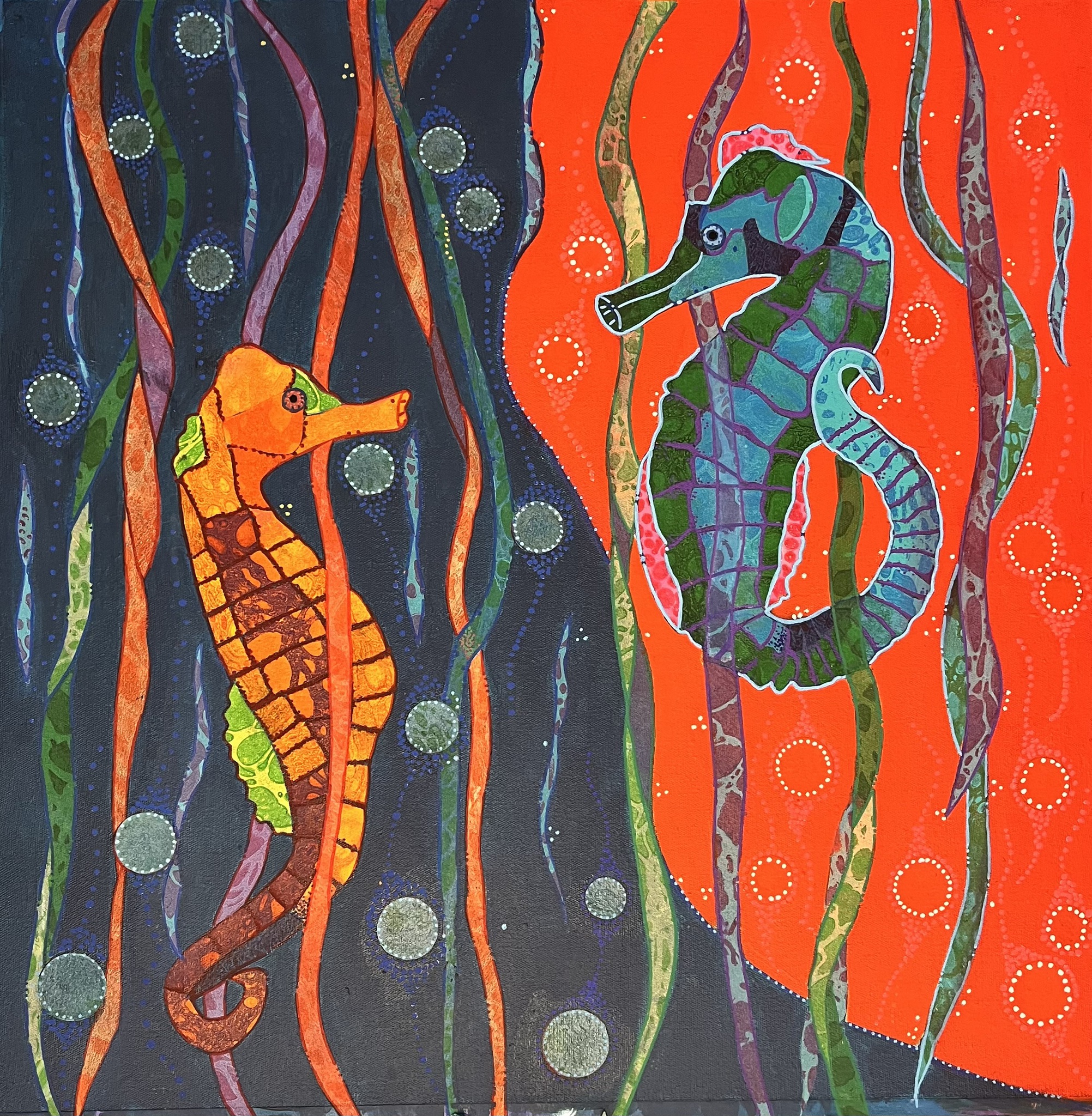 Ik maak collages van monoprints met acryl, gouache en inkt op rijstpapier.