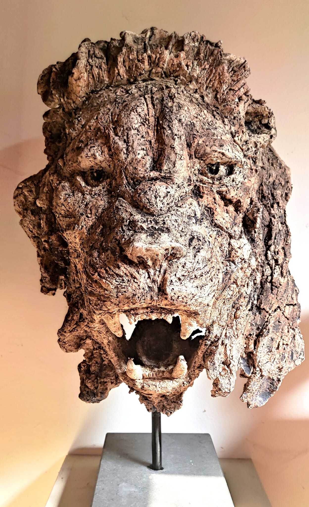 Dit beeld toont niet slechts een roofdier, maar een wezen gevormd door de tijd, strijd en overleving. De gebarsten rechterzijde staat symbool voor kwetsbaarheid, verval en de sporen die het leven achterlaat. De open bek spreekt van een kracht – een roep, een waarschuwing of misschien een laatste adem. “De brul van de tijd” wil een ode zijn aan de schoonheid van imperfectie en aan de kracht die huist in het gebrokene. Wat ooit heel was, draagt nu zijn littekens als teken van waardigheid Keramiek op blauwsteen