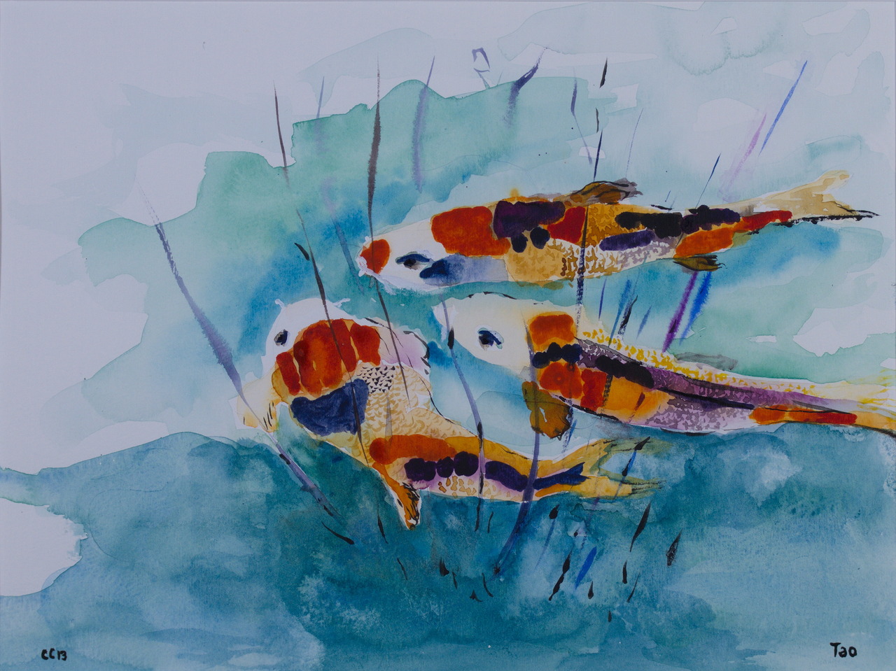 Tao Koi karpers Gemengde techniek met aquarel en inkt, ingelijst