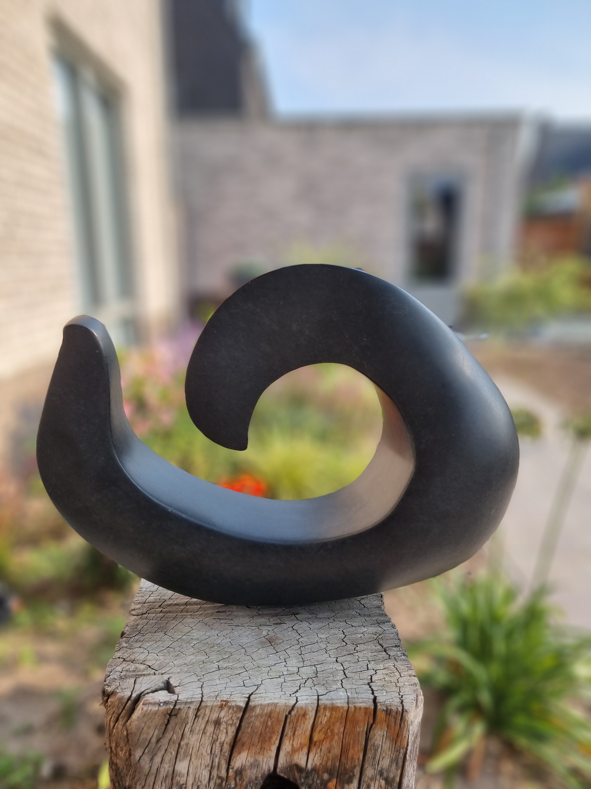 De golf. Zwarte serpentijn. Buitenbeeld Op meerpaal. Komtoorspronkelijk uit de haven van Harderwijk. Afmeting beeld 32x40x10 Afmetingen meerpaal 81x23x25 Totale hoogte 112 cm Op mijn nadere website www.carosbeelden.com zijn nog meer foto's van dit beeld te zien.