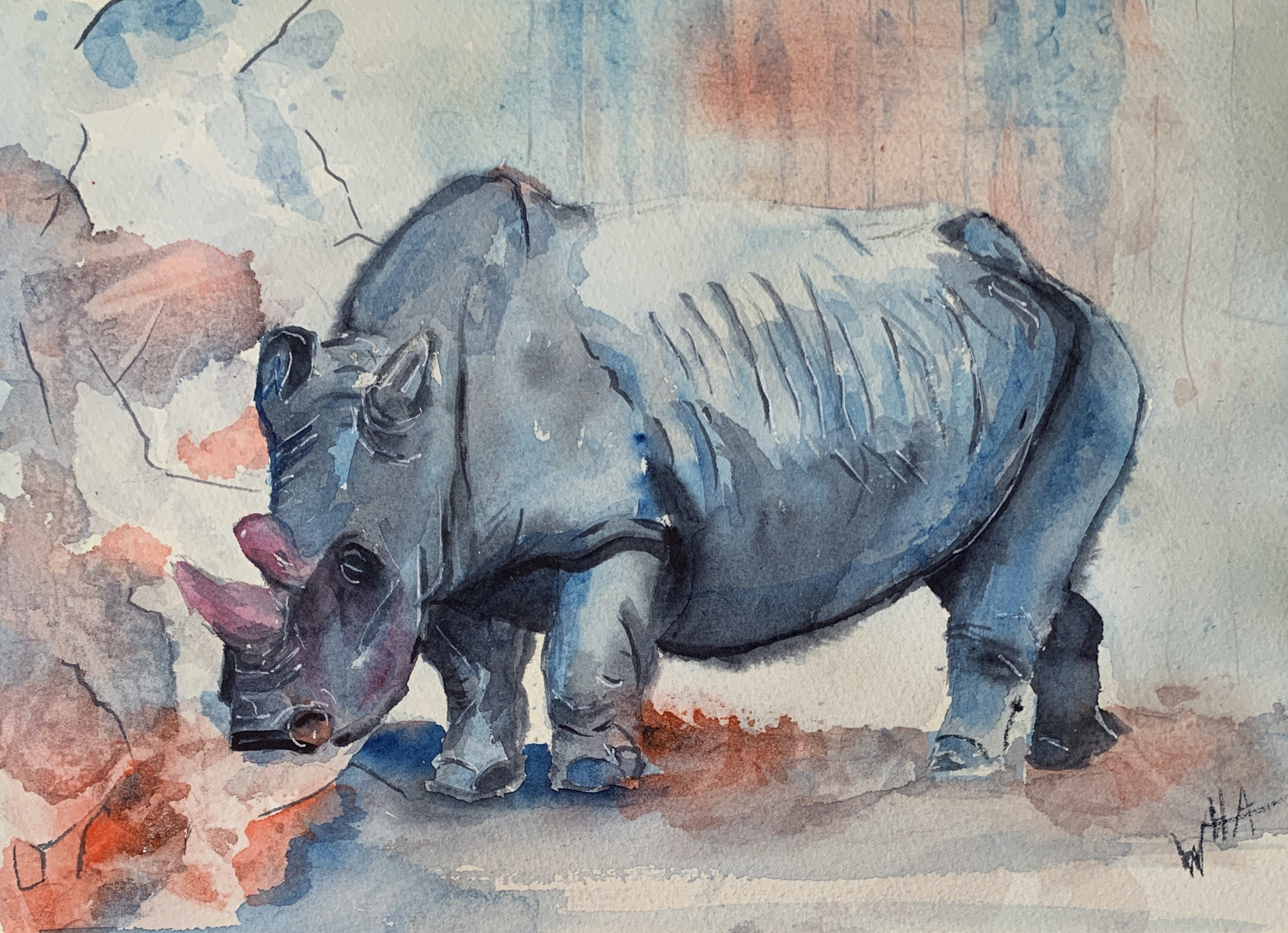Ik schilderde in deze periode graag dieren. Met deze neushoorn wil ik uitdrukking geven aan de kracht en schoonheid van dit grote dier