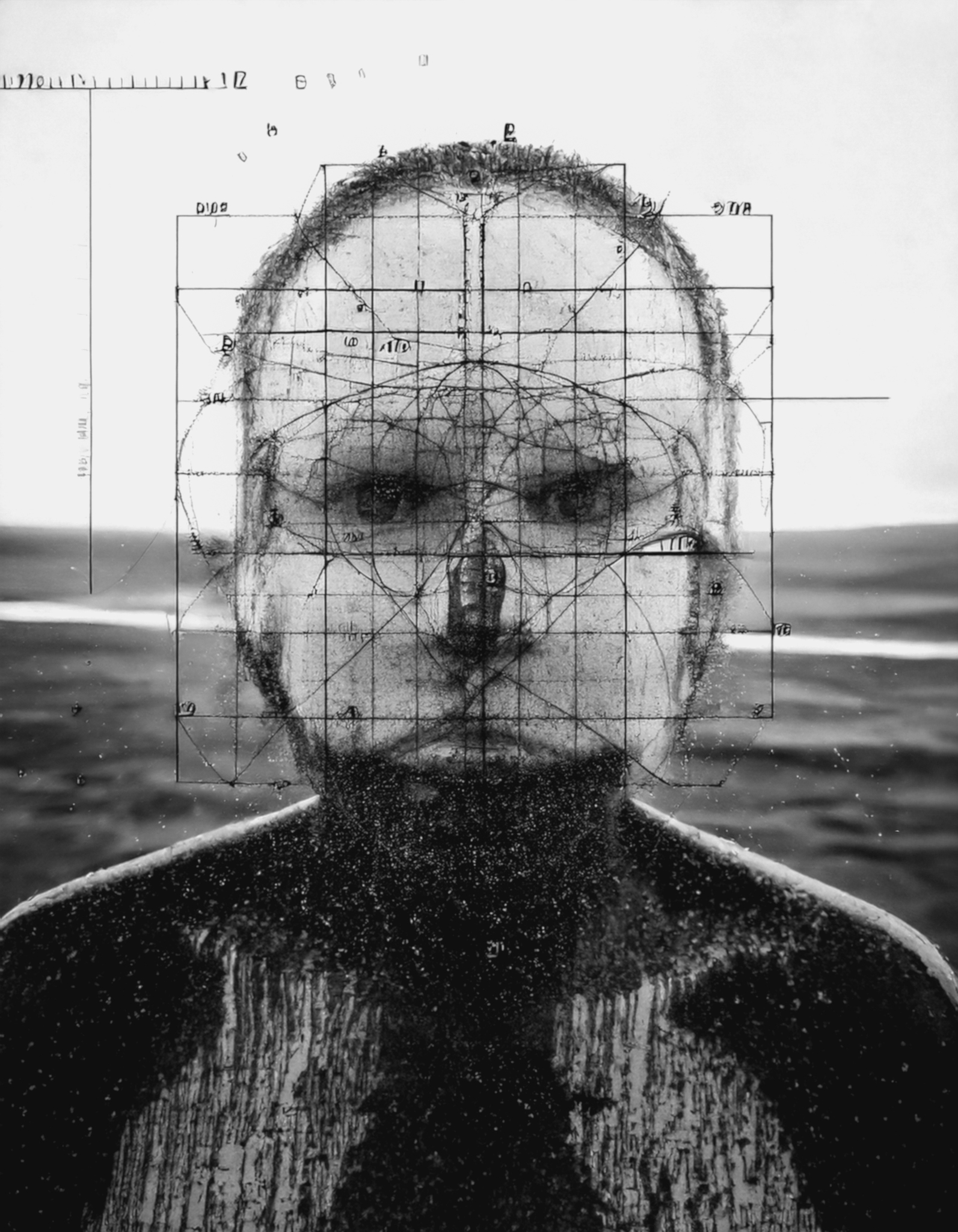 Klimaatverandering Klimaat Mutaties Aanpassingen Portret Manfiguur Man Zwartwit Natuur Landschap Wereldverval Mensheid Grafiek Ai Digitalekunst Digitalartist Contemporaryart Hedendaagsekunst Oorlogen