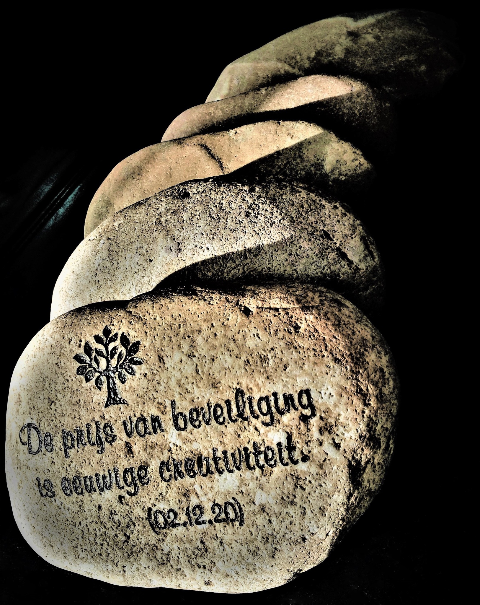 Foto van kleine installatie, geprint op stevig papier. De tekst is hier letterlijk fysiek permanent in de steen gegraveerd.