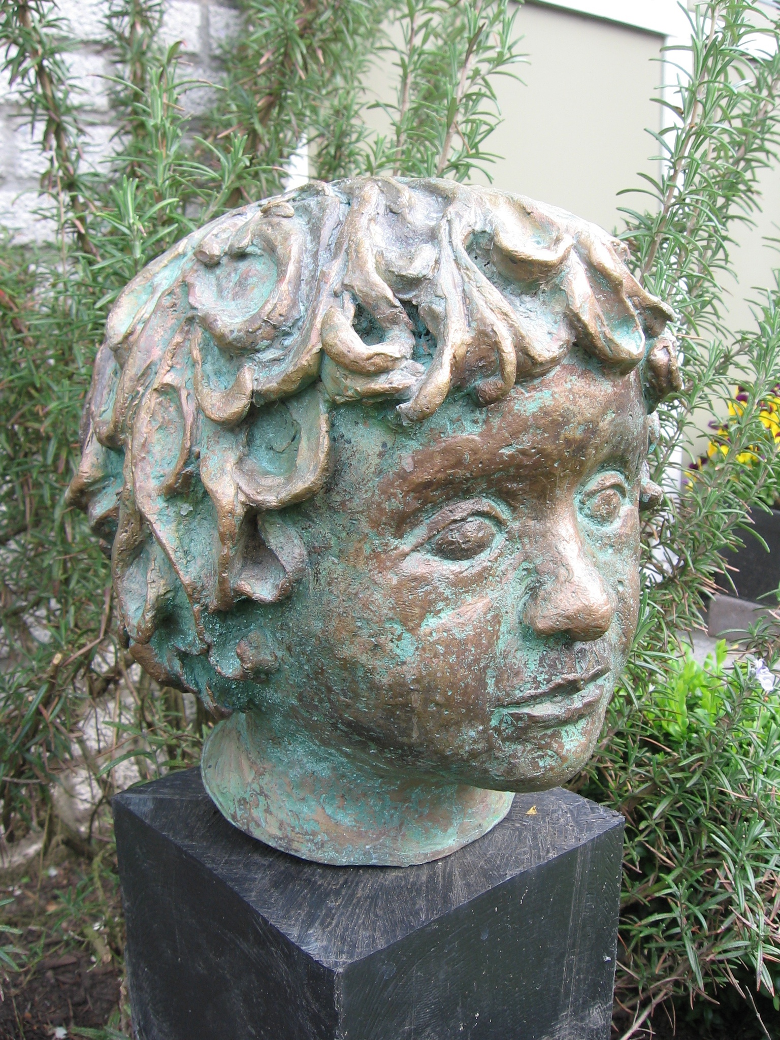 In opdracht heb ik drie portretjes mogen beeldhouwen in Belgisch hardsteen. Dit is Rowan. Ter voorbereiding heb ik lessen gevolgd bij Frank van der Loo en de drie portretjes eerst in was gemaakt en laten afgieten in brons. De stenen beelden staan op het terras bij de opdrachtgever, de bronzen heb ik zelf gehouden.