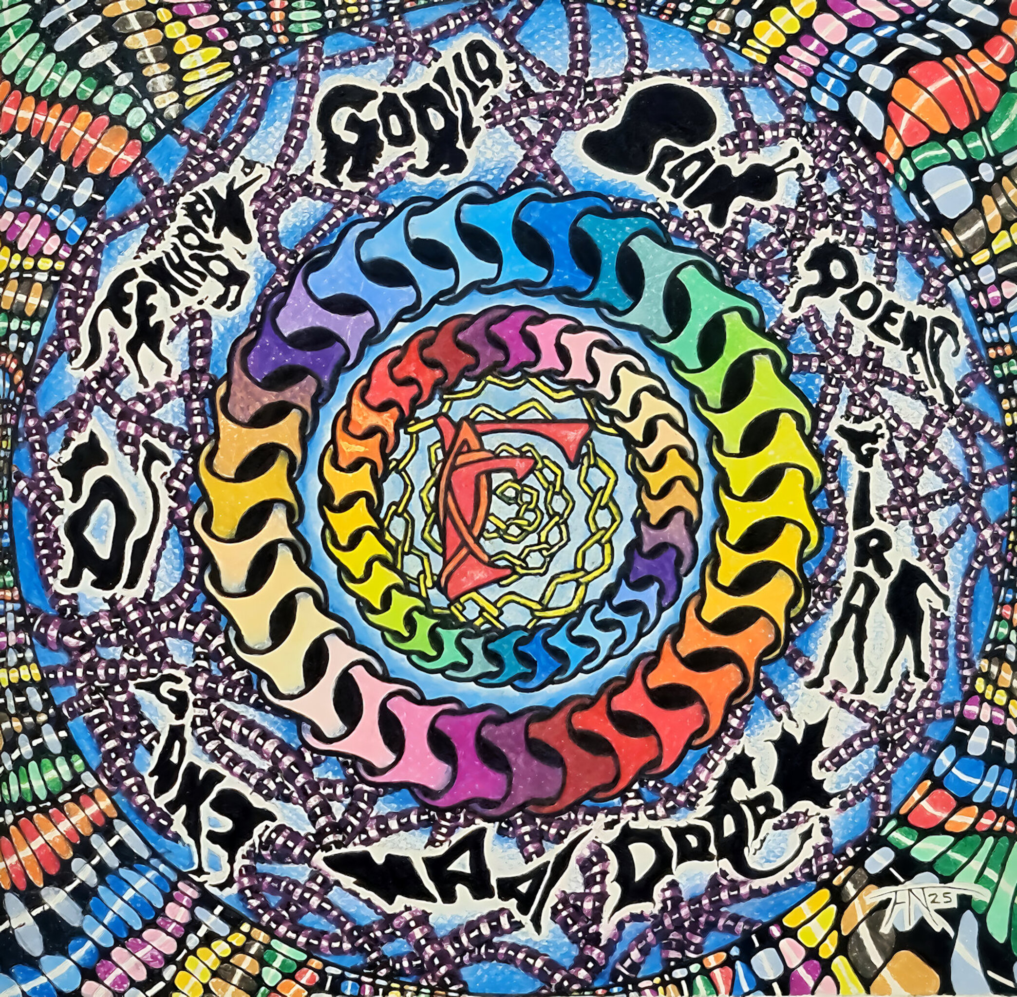 Op een achtergrond van Zentangle gestructureerde herhalende patronen (tangles) heb ik dierenwoorden getekend. Het geheel levert een bonte kleurrijke tekening op.