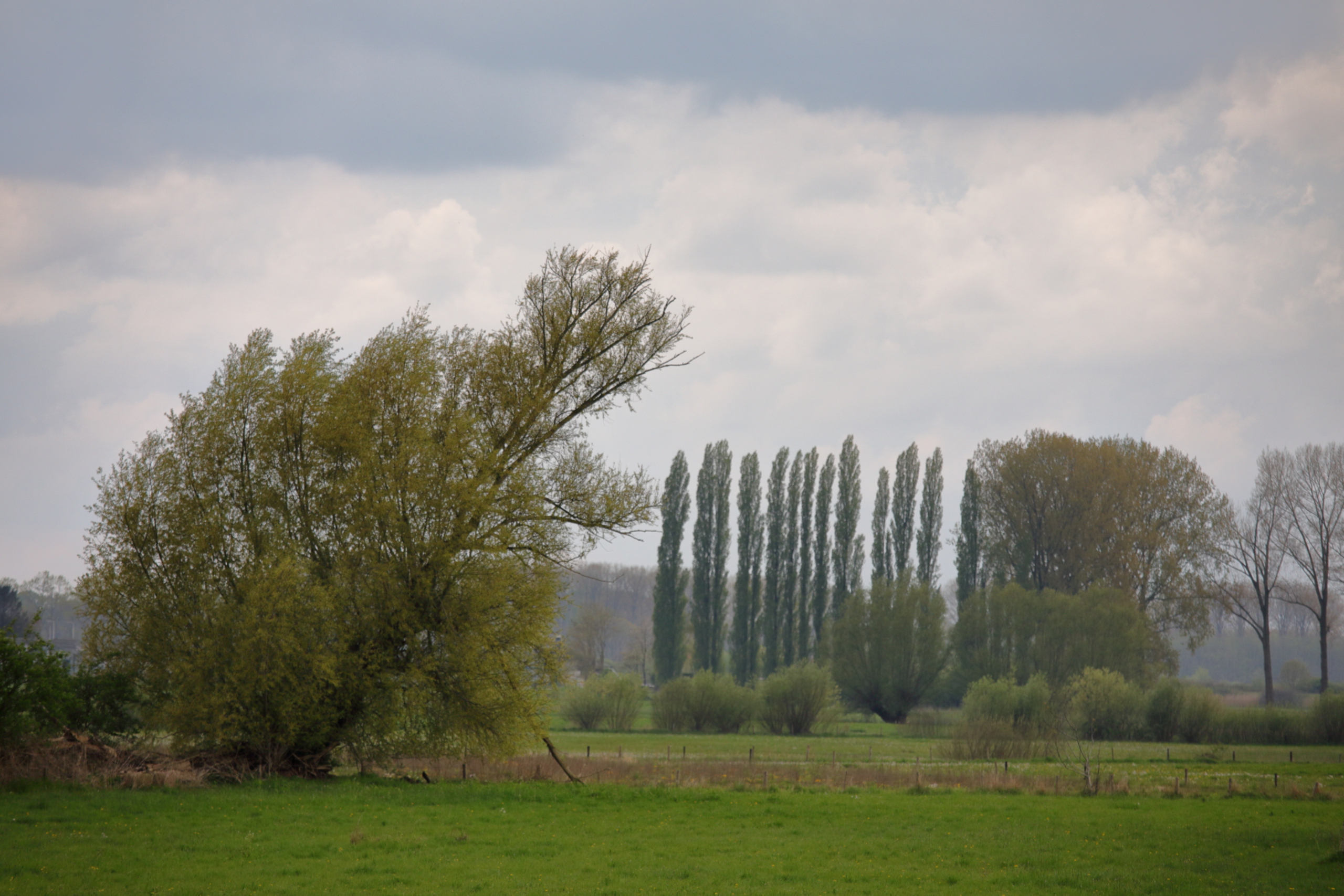 Een schietwilg op de voorgrond. Op de achtergrond zijn italiaanse populieren te zien en een ratelpopulier. Een fraai landschap in de uiterwaarden van een IJsselstrang.