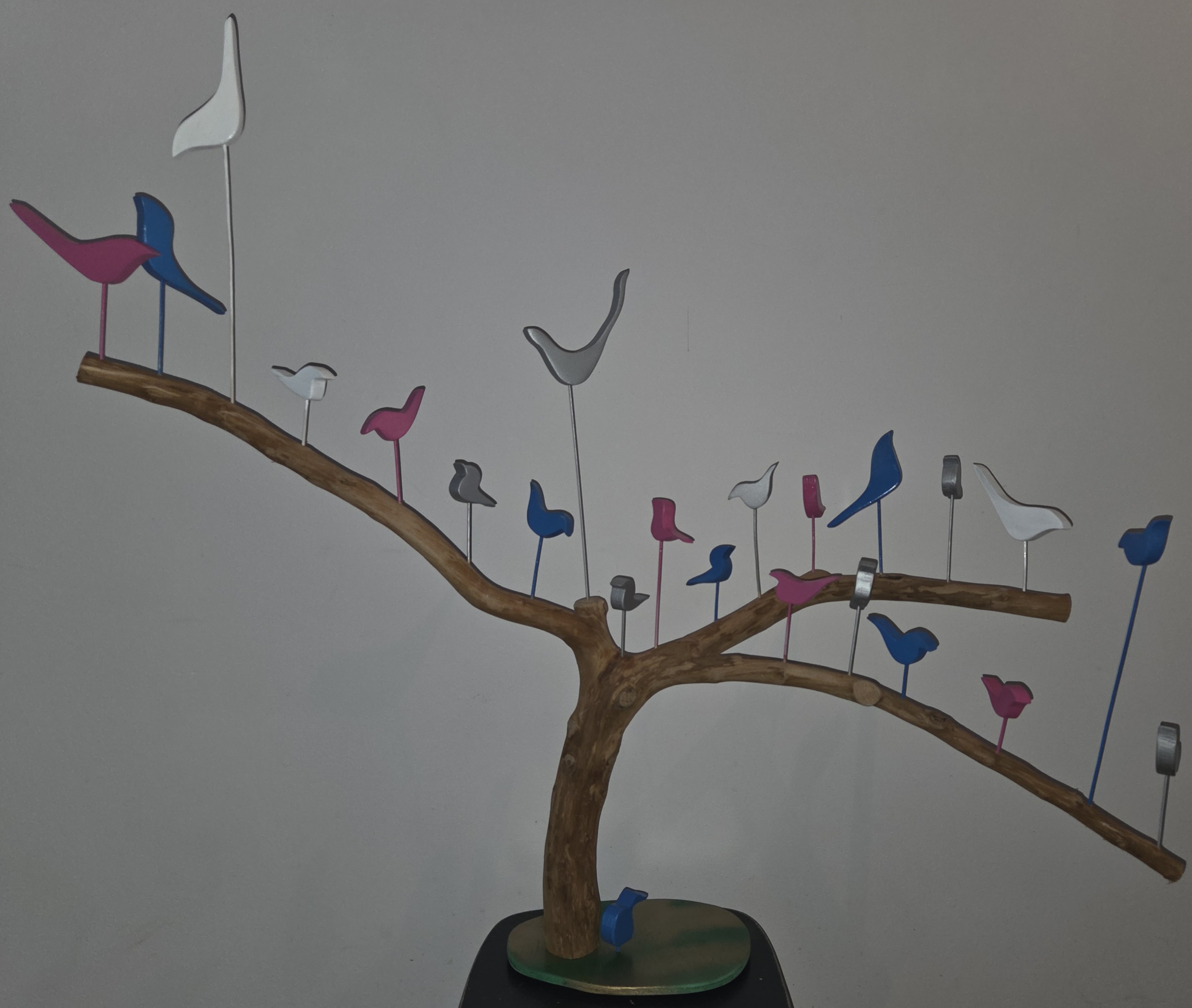 Top van oude appelboom met vogels. Hout, multiplex, saté prikkers en verf