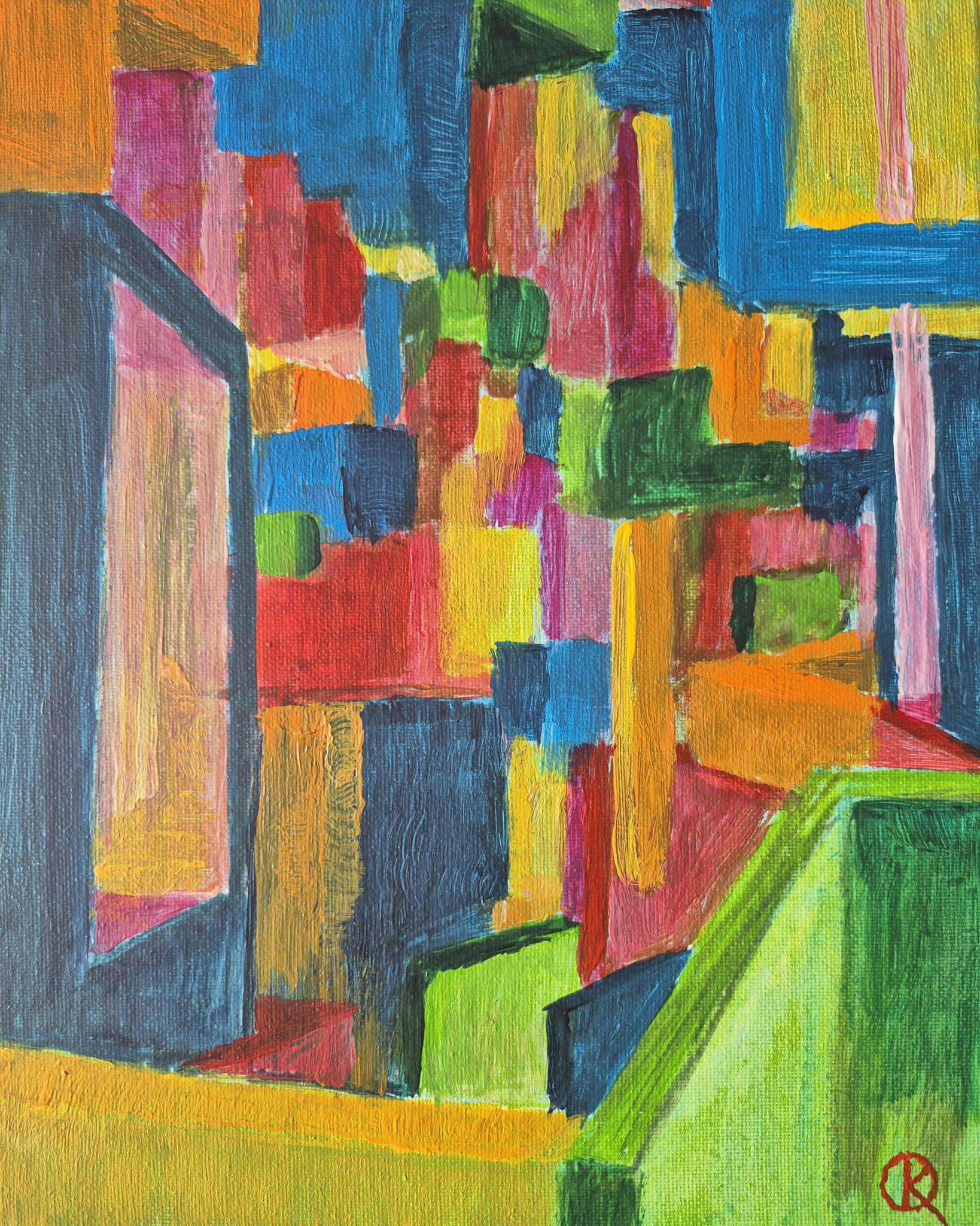Dit schilderij is een conceptuele studie en een visuele vertaling van een eigen architectonisch ontwerp. In plaats van een realistische weergave van de architectuur, zijn de vormen teruggebracht tot gekleurde vlakken die de sfeer, beleving en intentie van het ontwerp verbeelden. De compositie richt zich niet op detail of constructie, maar op de essentie van ruimte, ritme en harmonie zoals deze bedoeld zijn in het ontwerp. Het werk dient daarmee als een abstracte interpretatie die de kern van de architectonische visie zichtbaar maakt.