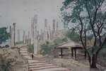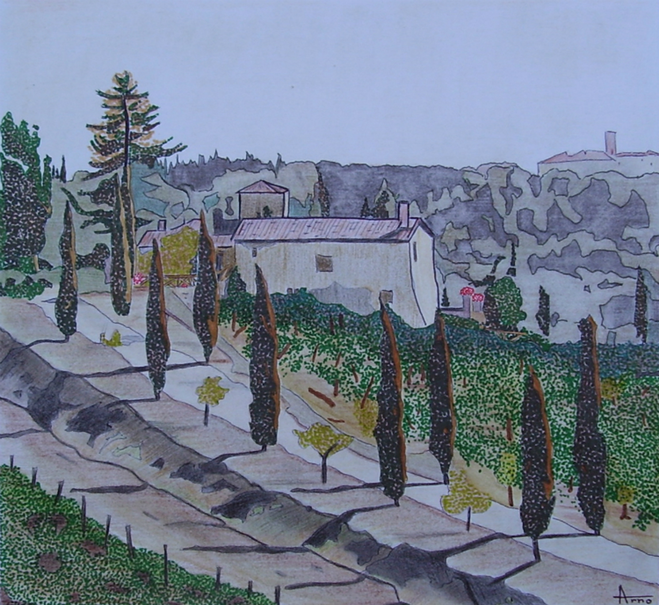 Tekening van een Toscaans landschap Potlood, inkt.