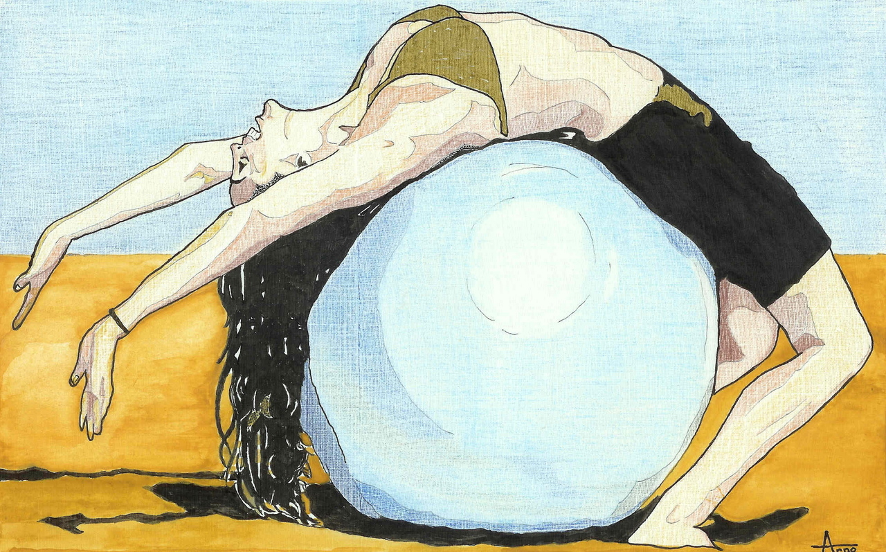 Tekening van een vrouw op een bal potlood, inkt A4 formaat