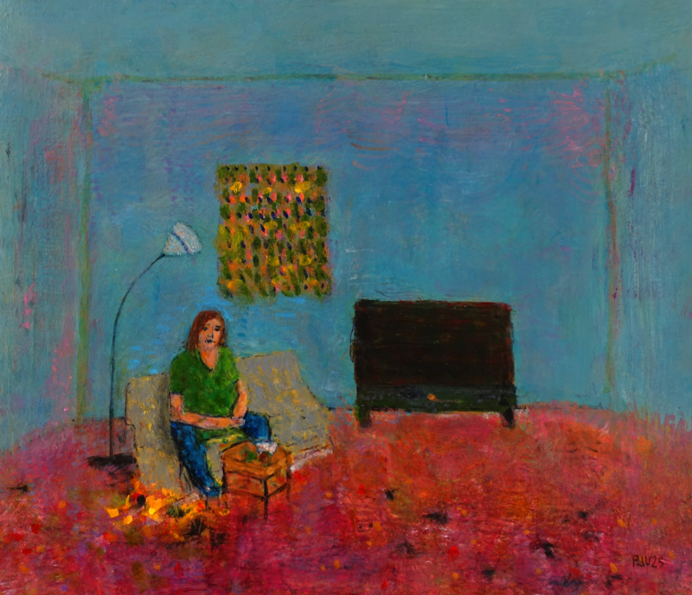 Mijn vrouw zat even precies goed. Maar de kamer is verder heel anders dan die van ons. De flatscreen vraagt veel aandacht. Dat is in vrijwel alle huiskamers. Glacerende olieverf lagen. Glaceren verdiept de kleur enorm.