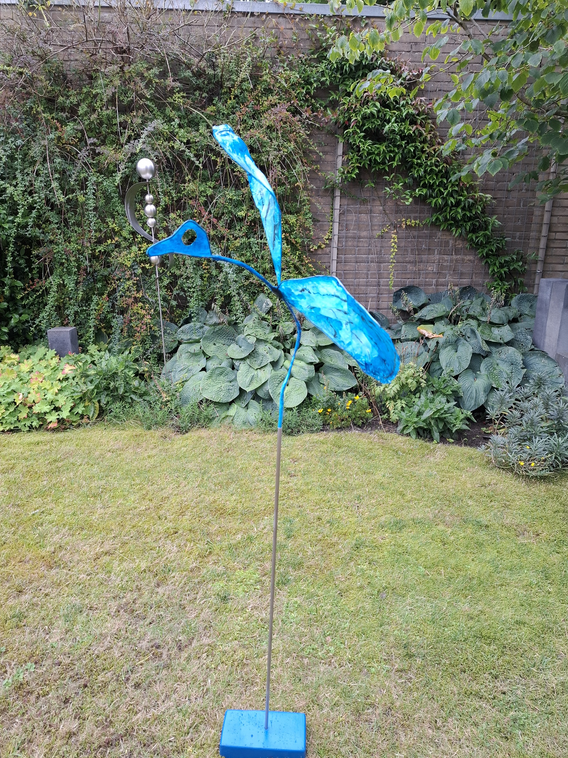 Blauwtje, Gemaakt van/met koperdraad, transparant papier en aquarelverf (blauw). Het papier is verstevigd met een textielverharder. Uiteindelijk afgewerkt met vernis en gemonteerd op een rvs-stang en blauwe houten sokkel.