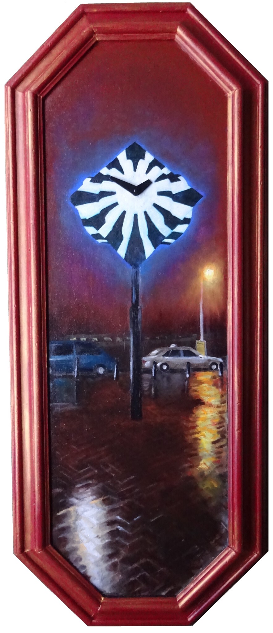 Geüpcyclede passpiegel met binnen de originele lijst een schildering van de Zebraklok. Deze klok werd in 1975 ontworpen door Jaap Karman, is tegenwoordig verplaatst naar De Binckhorst maar staat op deze 'Schilderijklok' nog op het plein voor Station Den Haag CS. De naam 'Schilderijklok' draagt het werk omdat het voorzien is van een quartzuurwerk en dus ook echt de tijd aangeeft.